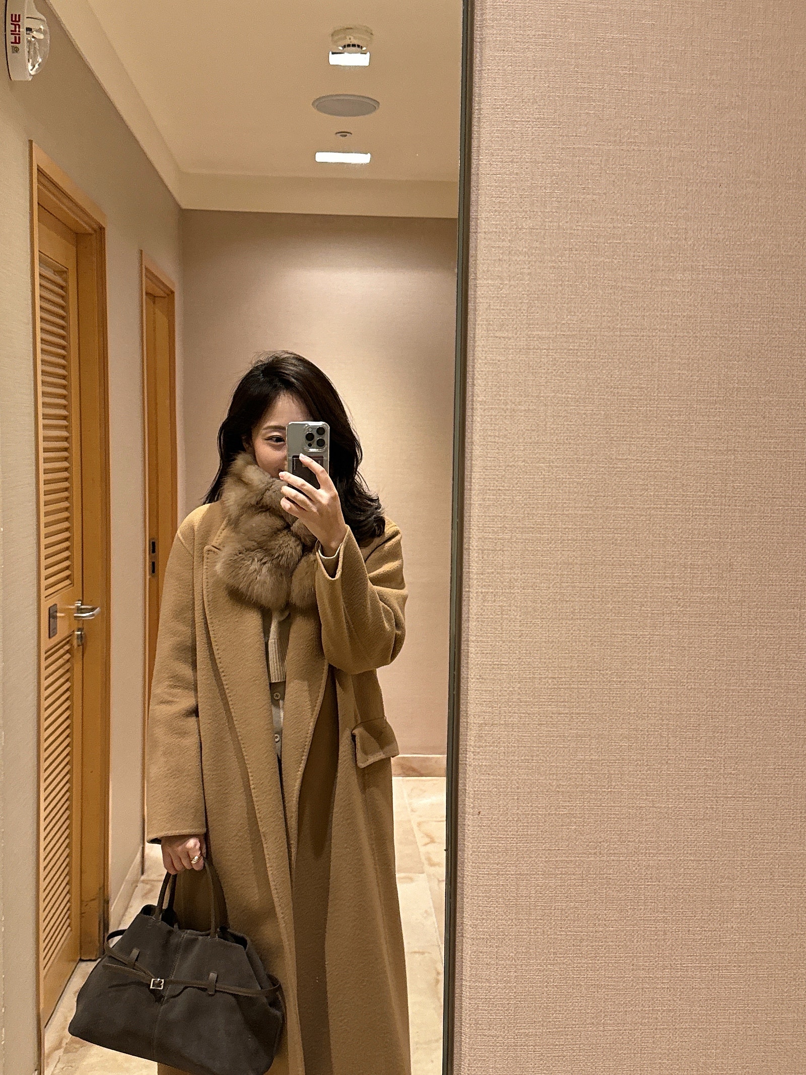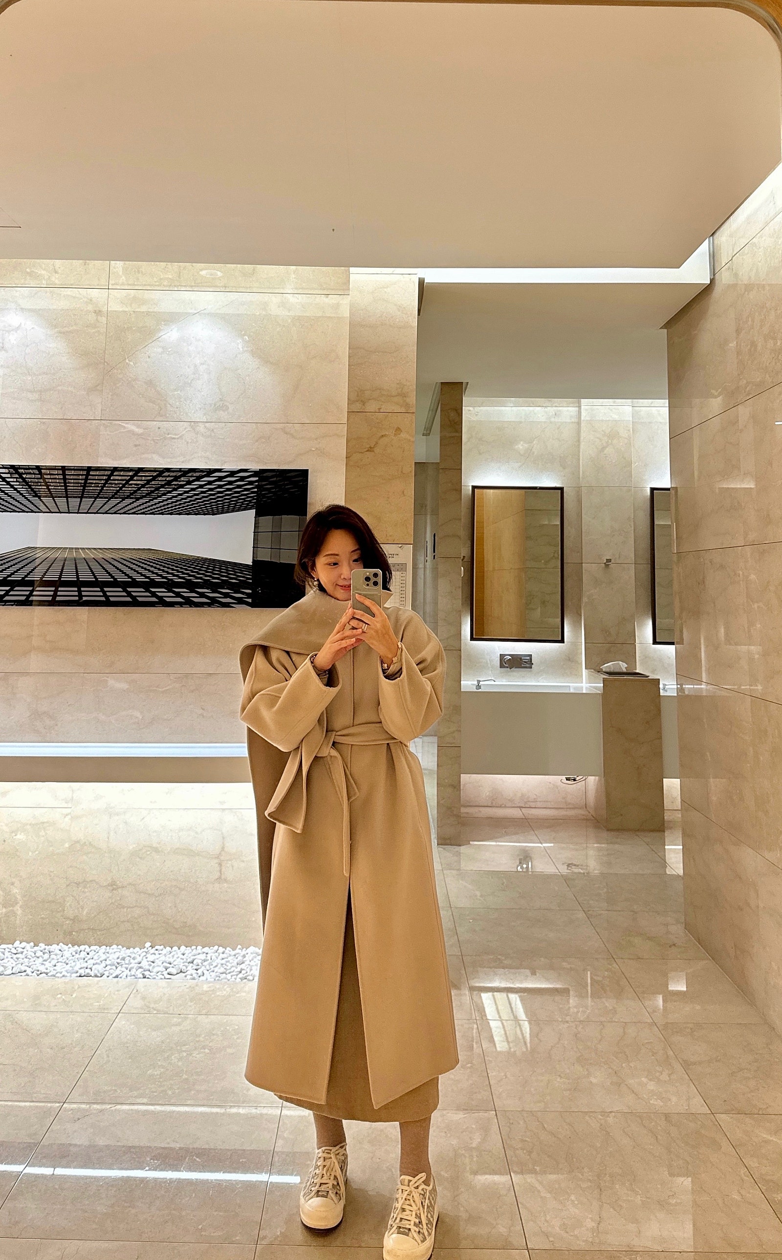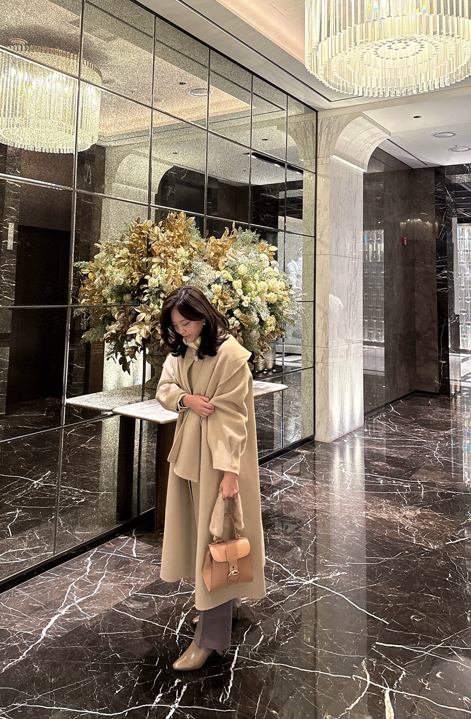 무릎 아래로 내려오는 롱한 길이감의 코트는 오히려 키도 커 보이고 비율도 좋아보여요.