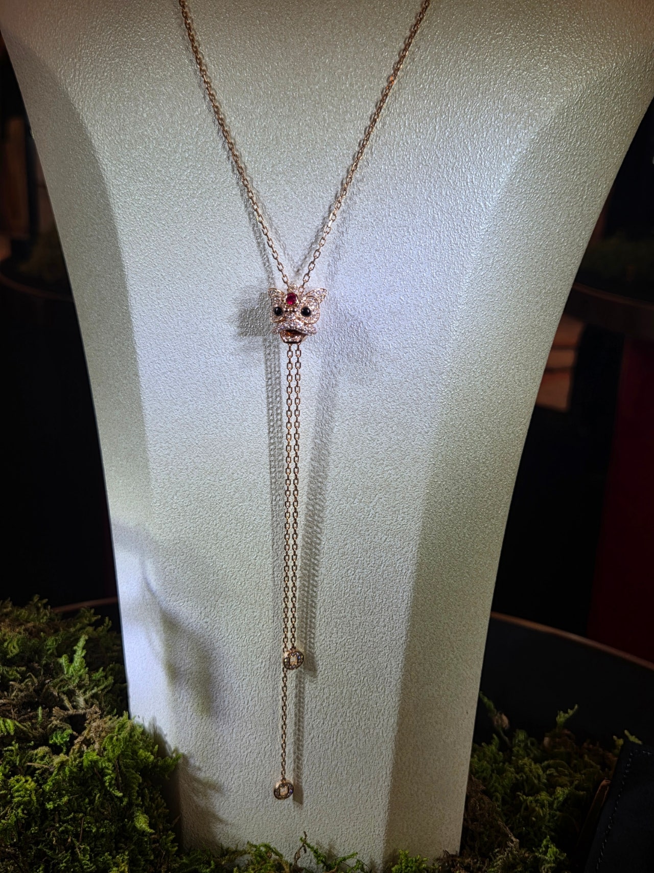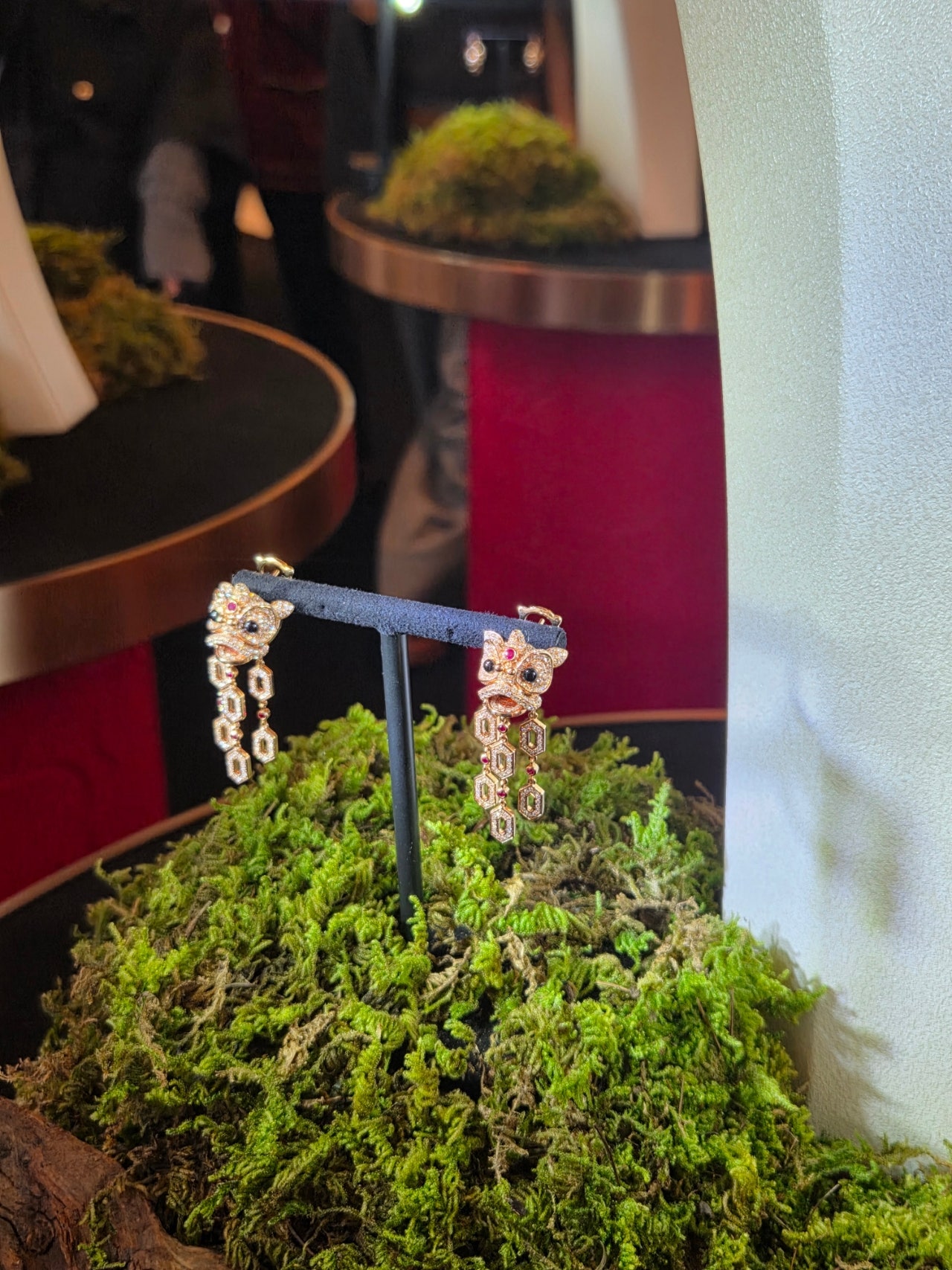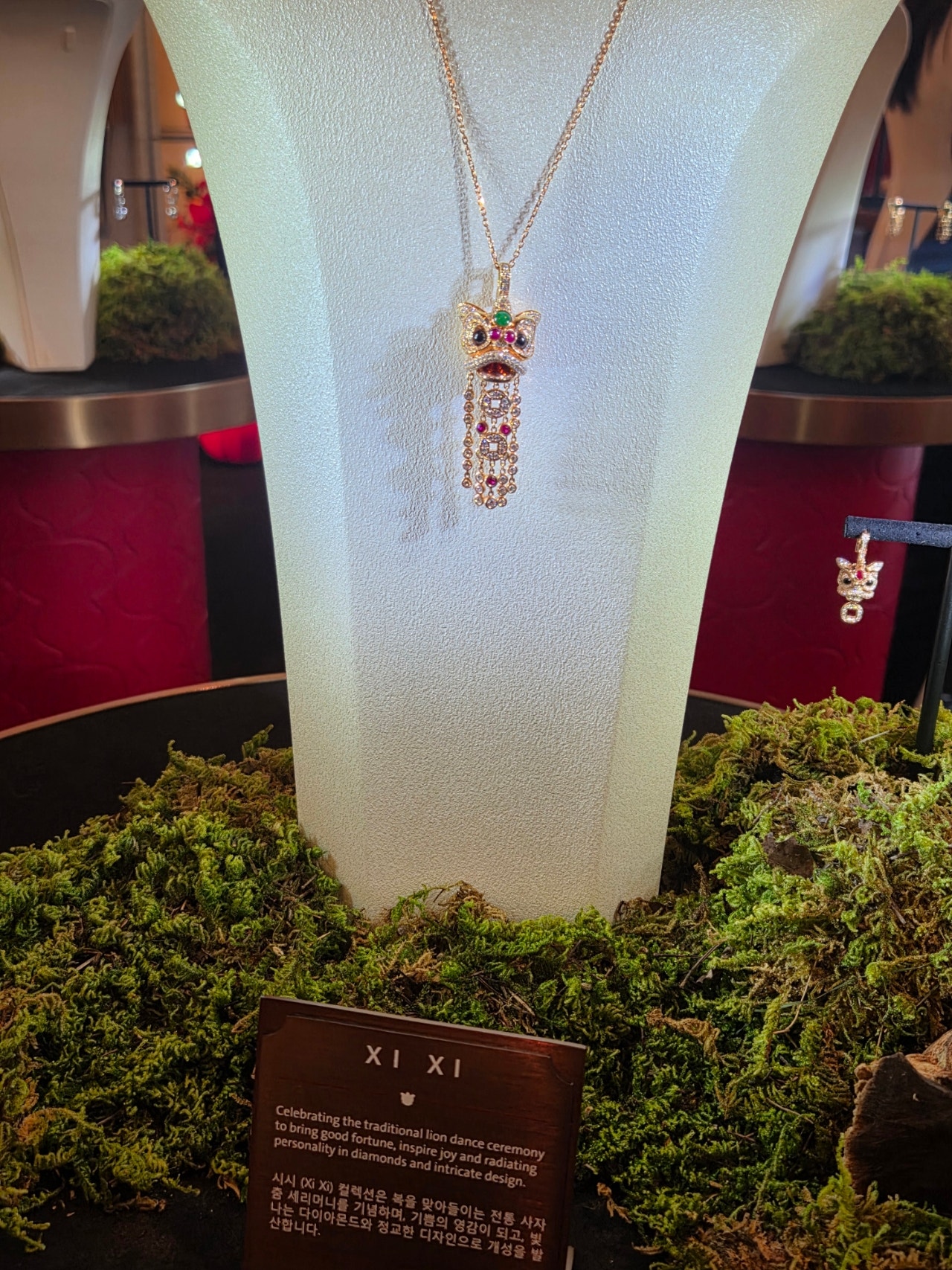 키린의 주얼리 피스들은 판다, 금붕어, 사자 등 자연 속 생명체를 모티브로 한 작품들이 주를 이루었는데요. 그중 제게 특히 인상 깊었던 건, 바로 사자춤을 한 땀 한 땀 천연 다이아와 유색 주얼리로 유려하게 커팅한 XI XI 시리즈였어요.