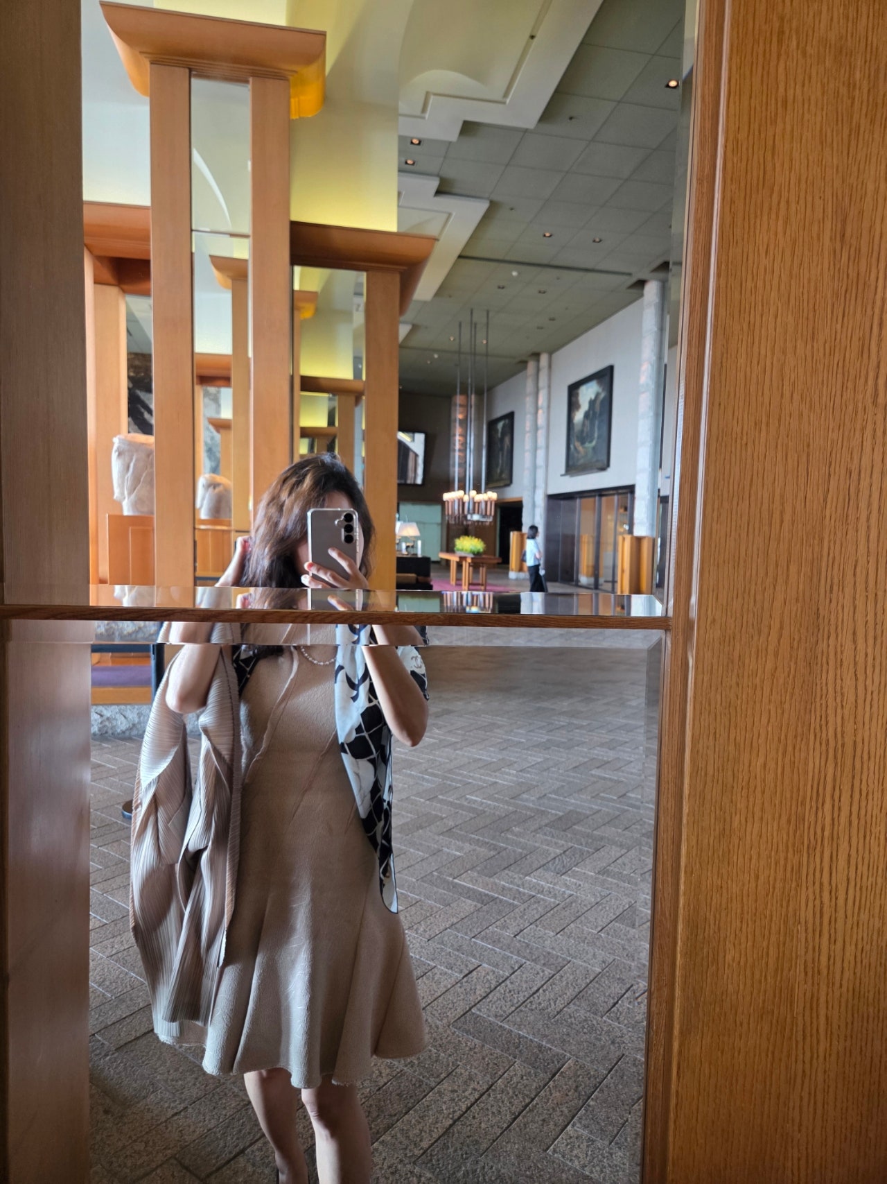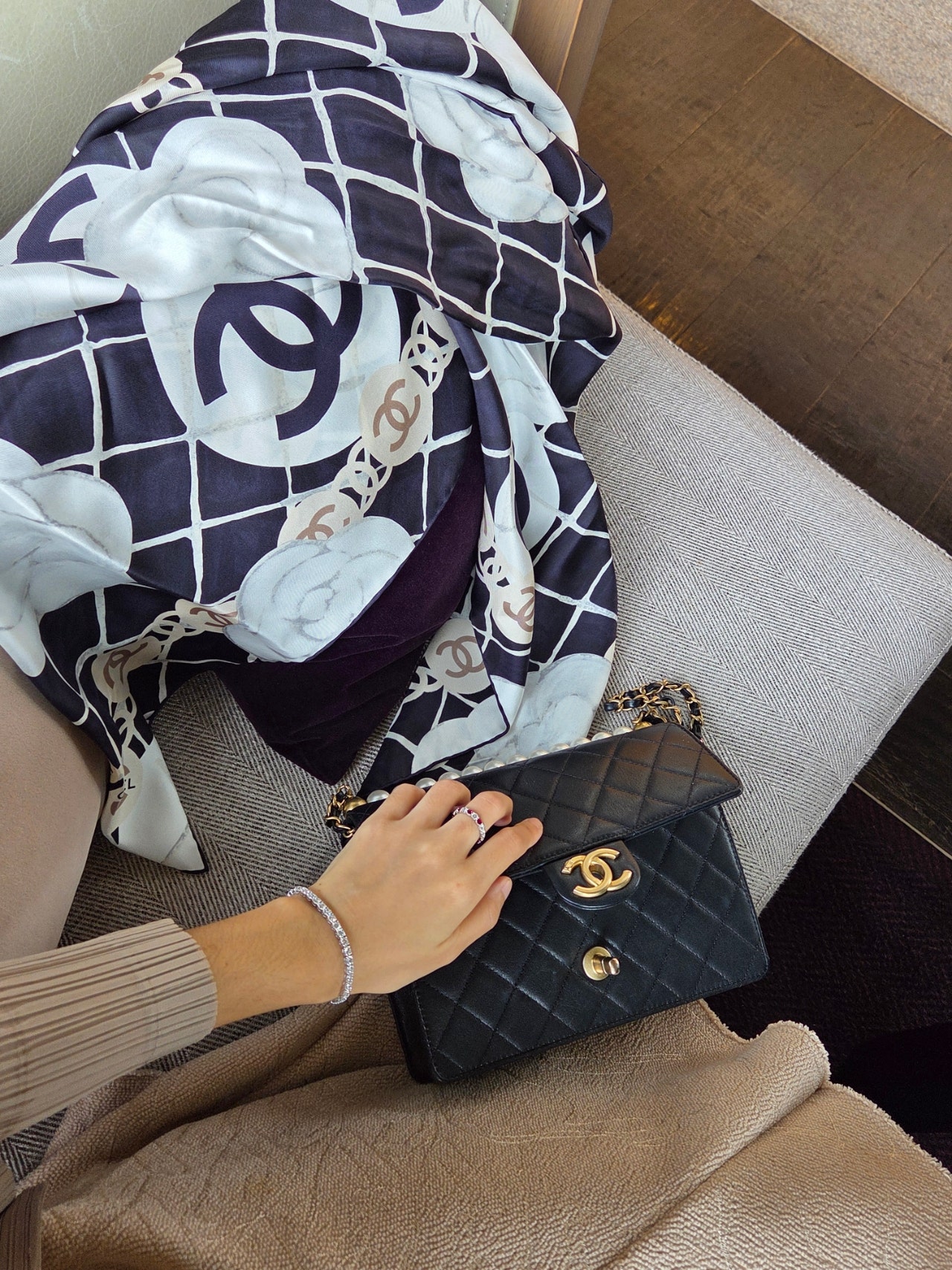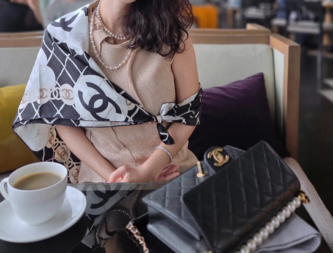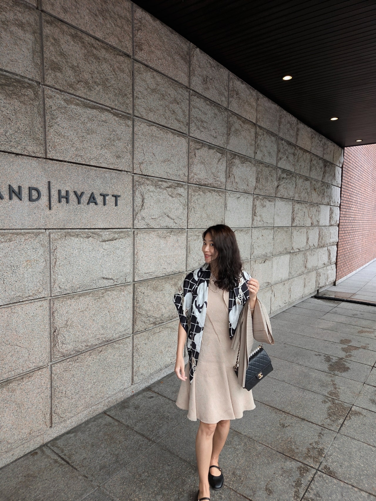 최근 샤넬 칵테일 파티에서 운명처럼 만났던 샤넬 까멜리아 스카프를 처음 착용한 날이었어요. 하얏트 로비의 앤틱하면서도 웅장한 분위기와도 절묘하게 어우러지더라고요.