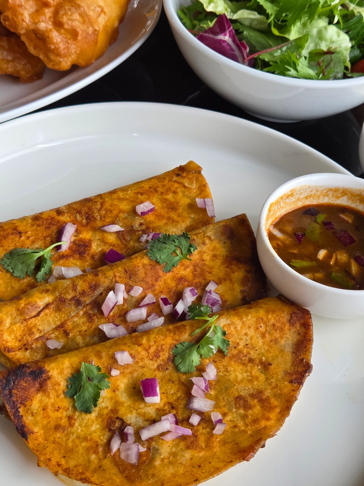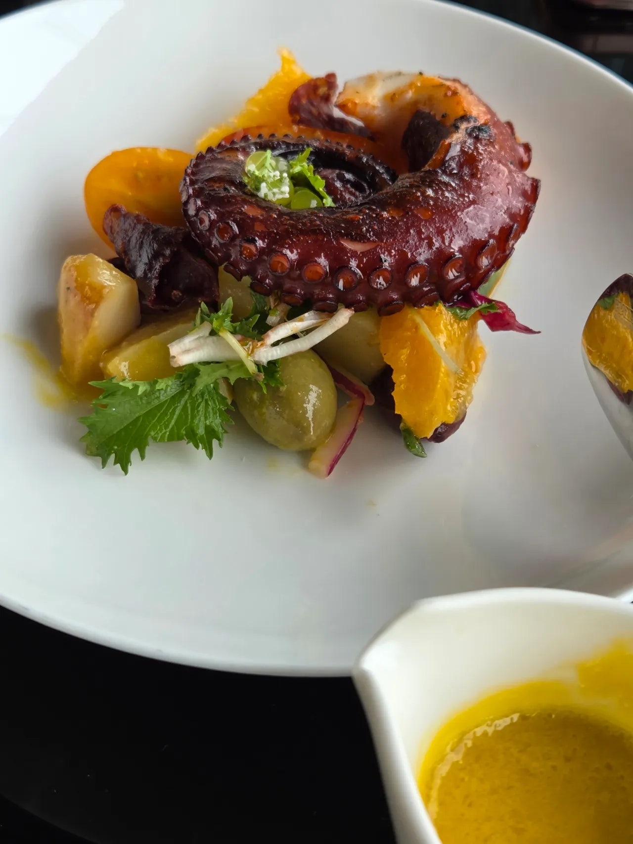 · 고수 드레싱을 곁들인 소고기 타코 (좌) / 레몬 드레싱을 곁들인 문어 세비체 샐러드 (우)