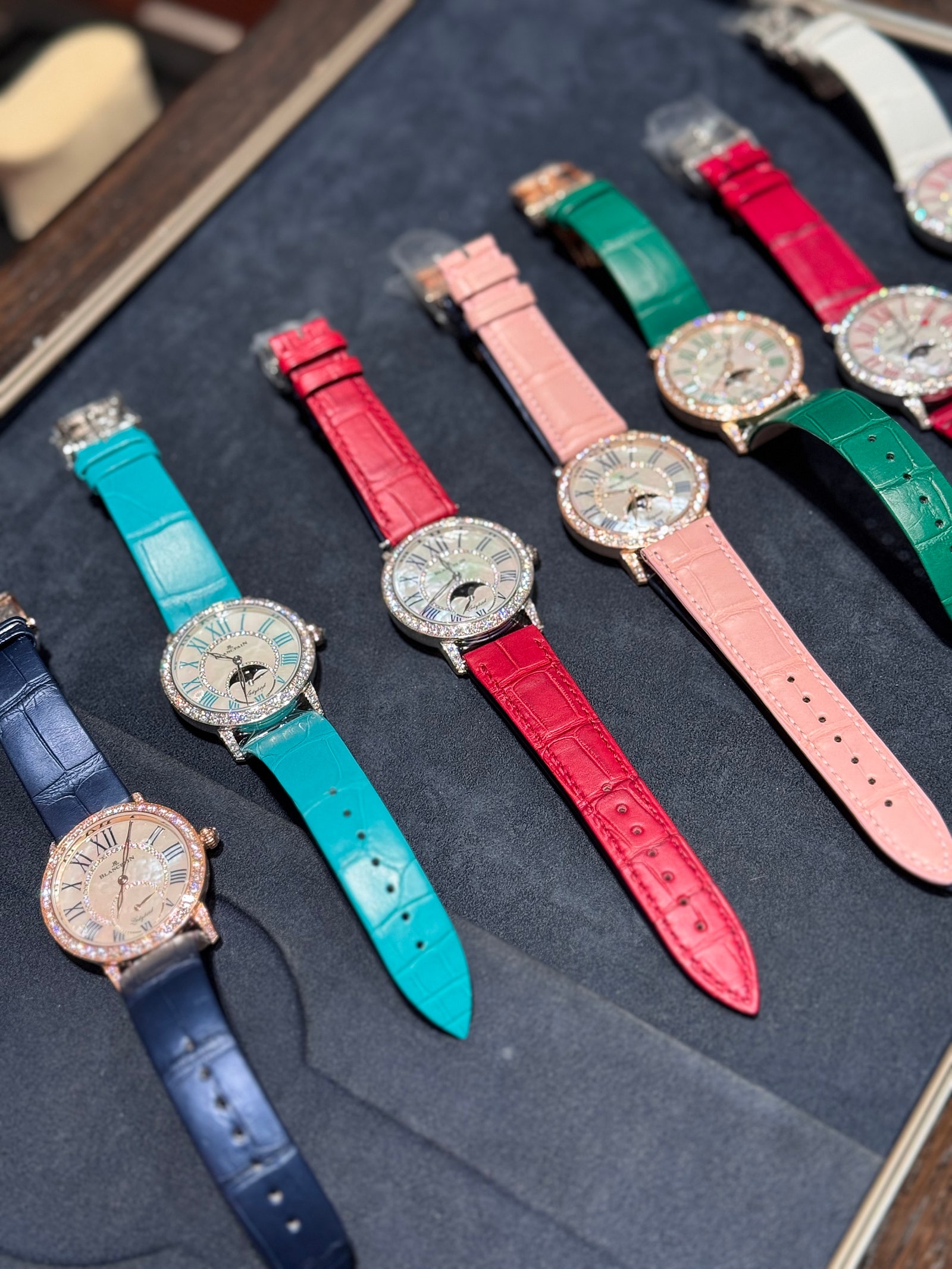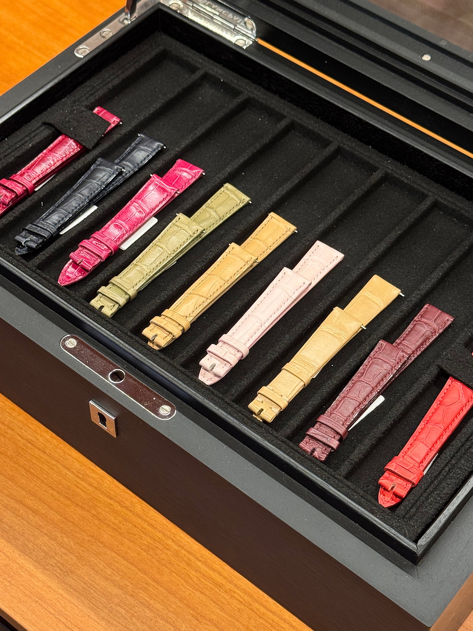 오른쪽 러그 크라운은 2.2 캐럿의 다이아로 세팅되어 있으며, 여러 색상의 엘리게이터 가죽 줄이 있어요.