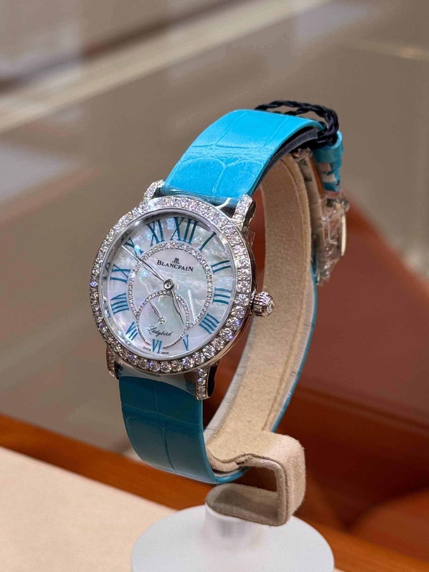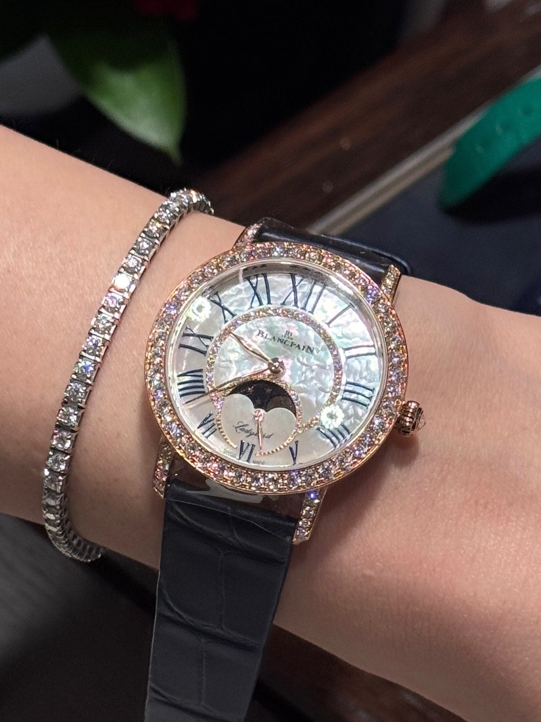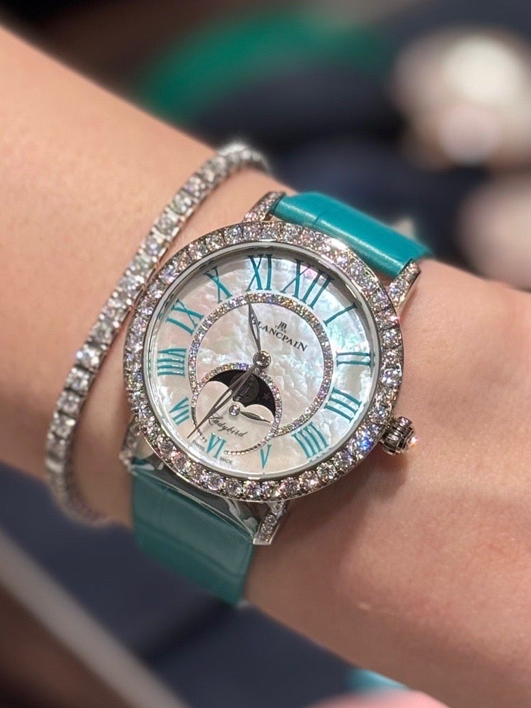 블랑팡 브랜드는 마릴린 먼로가 가장 소중하게 여긴 타임 피스로 다이아몬드가 세팅된 우아한 워치예요.