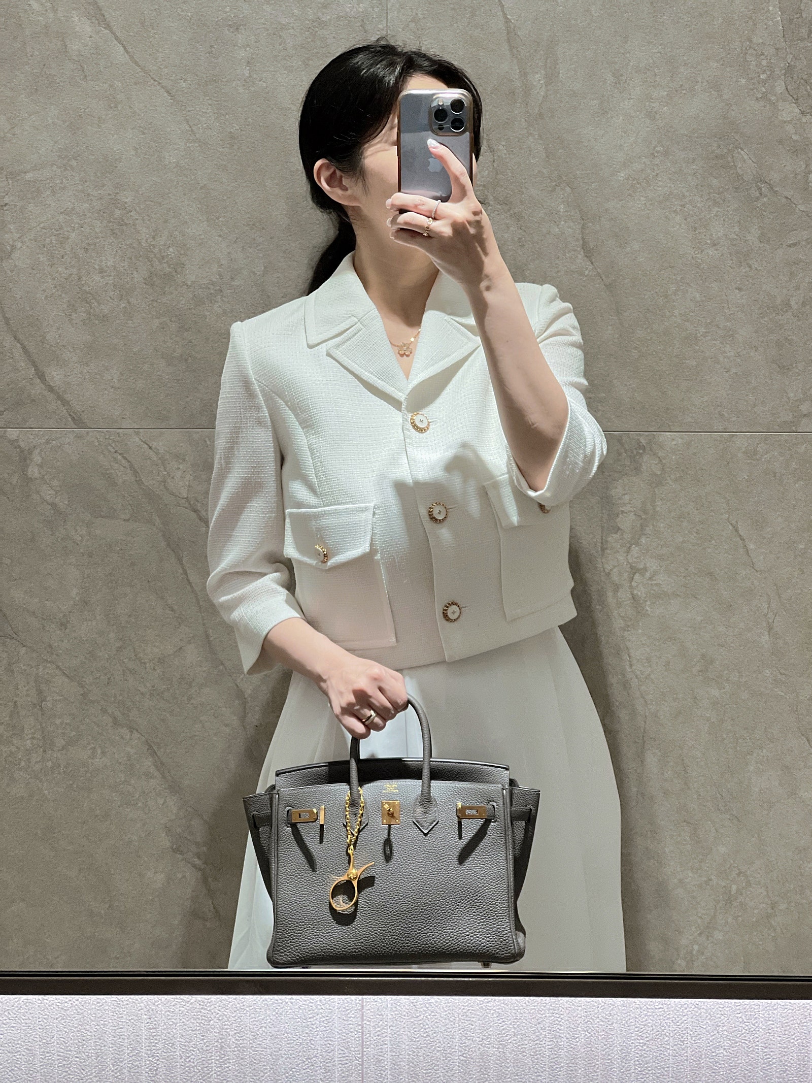모조에스핀 화이트 트위드 자켓에, 온앤온 화이트 핀턱 플레어스커트, 골드 아이템들 심플하게 착용💛
