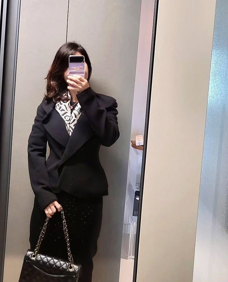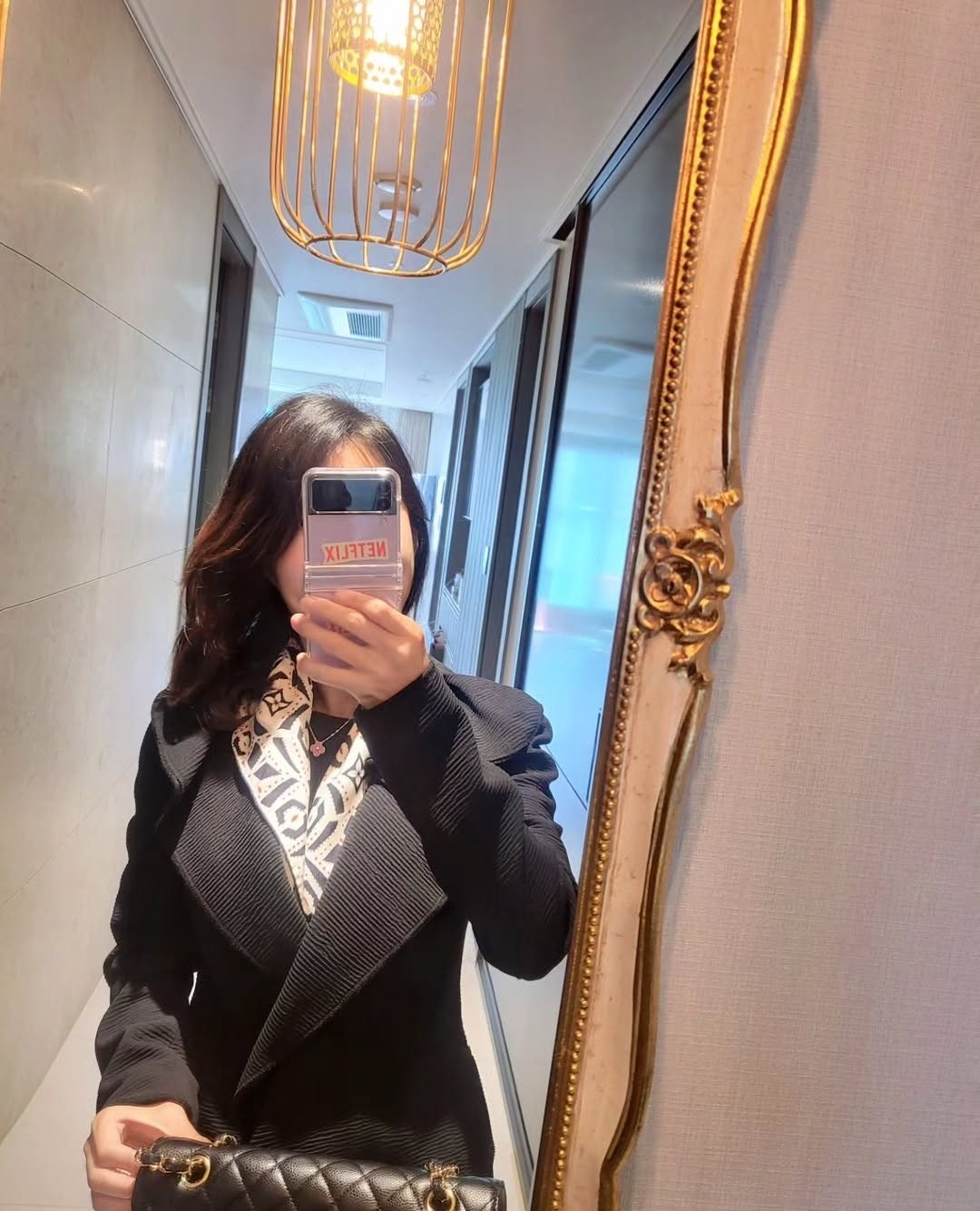 다소 밋밋한 올블랙의 자켓 정장룩에 은은한 포인트를 주는 용도로 좋습니다. 자칫 𝒕𝒐𝒐 𝒄𝒉𝒊𝒄 해 보일 수 있는 룩에 온기 불어넣어 준다고나 할까요?🌬🖤