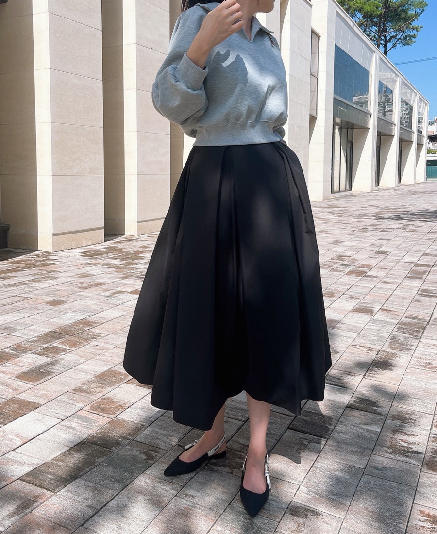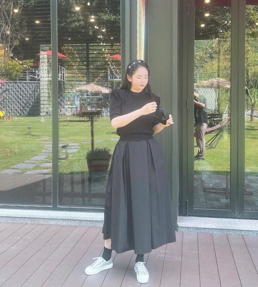 보시면 원피스, 스커트와도 잘 어울리고 캐쥬얼에도 찰떡이에요. 제가 롱스커트, 롱원피스, 롱슬랙스 등 롱한 옷을 좋아하는데 오히려 슬링백을 매치했으면 좀 과했을텐데 스니커즈로