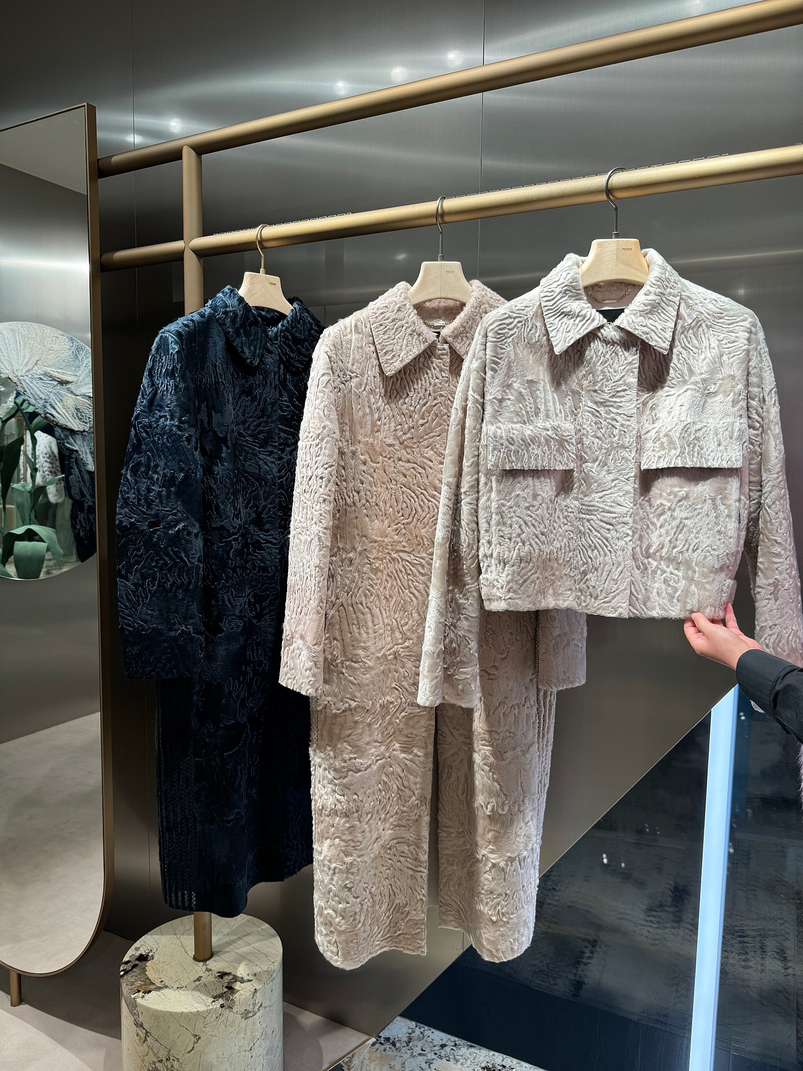 3층에 남성 퍼를 한 바퀴 돌아보았는데 진짜 관심이 없었는지 사진이 거의 없네요. 맨 오른쪽에 걸린 퍼 종류들이 정말 멋졌는데, 밍크를 깎아서 펜디 FF 주카로고를 만든 거였어요. 퍼를 너무 짧게 깎아 약간 스웨이드나 시어링처럼 보일 수도 있는데 기법 자체가 너무 정교해서 멋졌어요. 사실 남자분들은 밍크 퍼가 긴 걸 선호하지 않아서 깎은 밍크를 찾으시는 분들이 꼭 있더라고요. 마네킹에 퍼는 작년도에도 있던 퍼 디자인에 후드를 달아서 새로 나왔네요. 남성용은 밍크 바시티자켓도 있어요.
