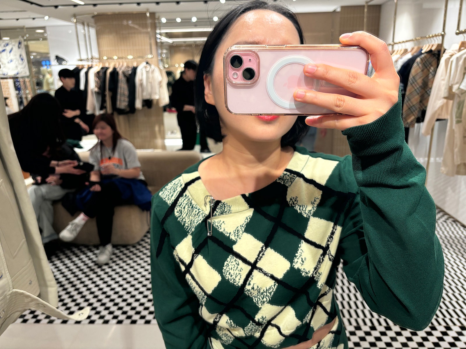 이번 상의가 미다움 사이즈. 크롭함이 더욱 올라와서 당황했지만, 예쁜 그린 색감과 체크무늬에 즐거웠습니다.