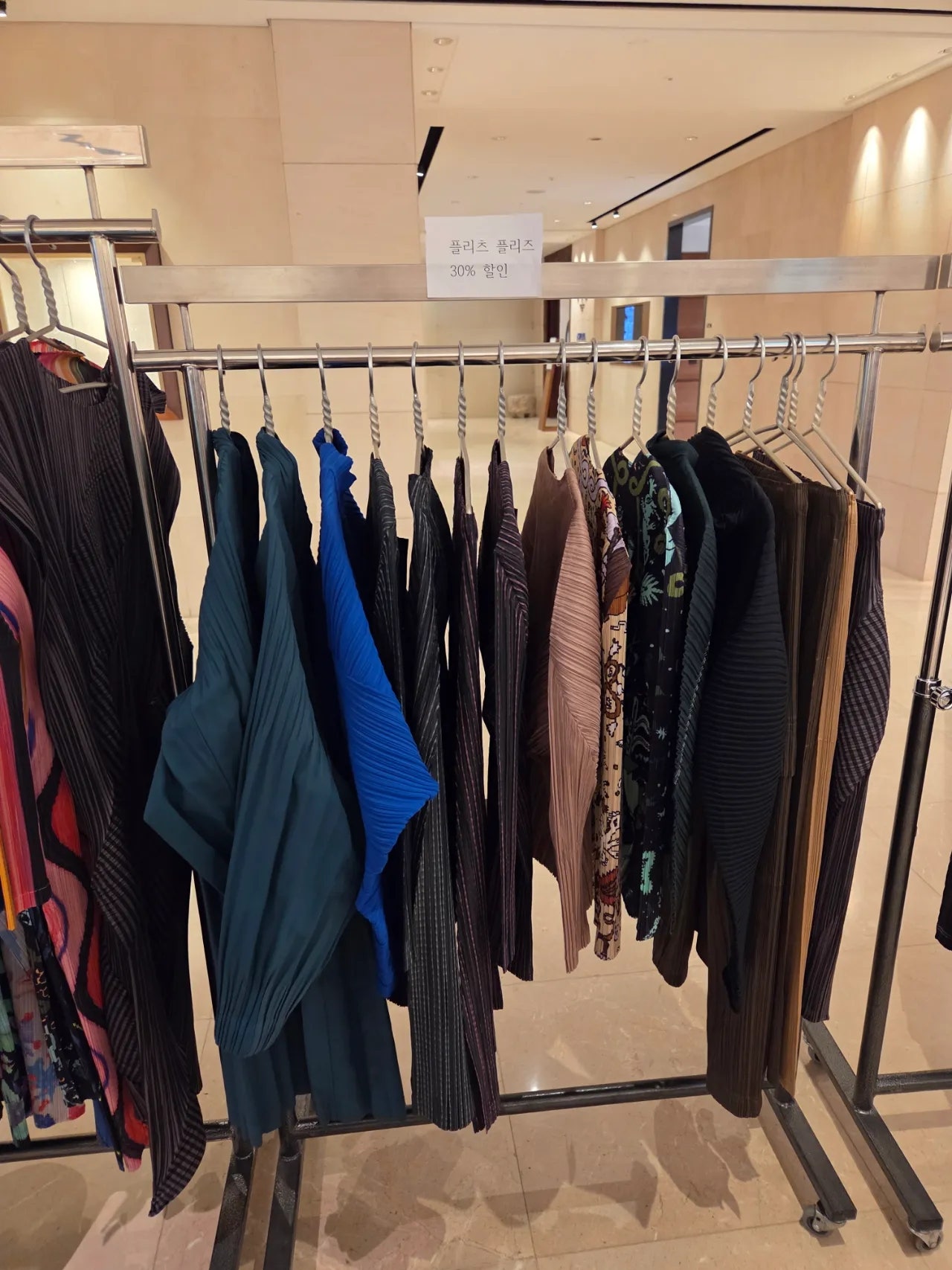매해 이세이미야케 백화점 매장에서 통상 시즌이 끝날 때쯤 시즌오프에 들어간다는 걸 알고 있었는데요. 특별히 올해 신라호텔 아케이드점에서는 몇 년 만에 '플리츠플리즈' 품목 또한 세일에 포함되었다는 소식을 들어 시간을 쪼개어 다녀왔어요.