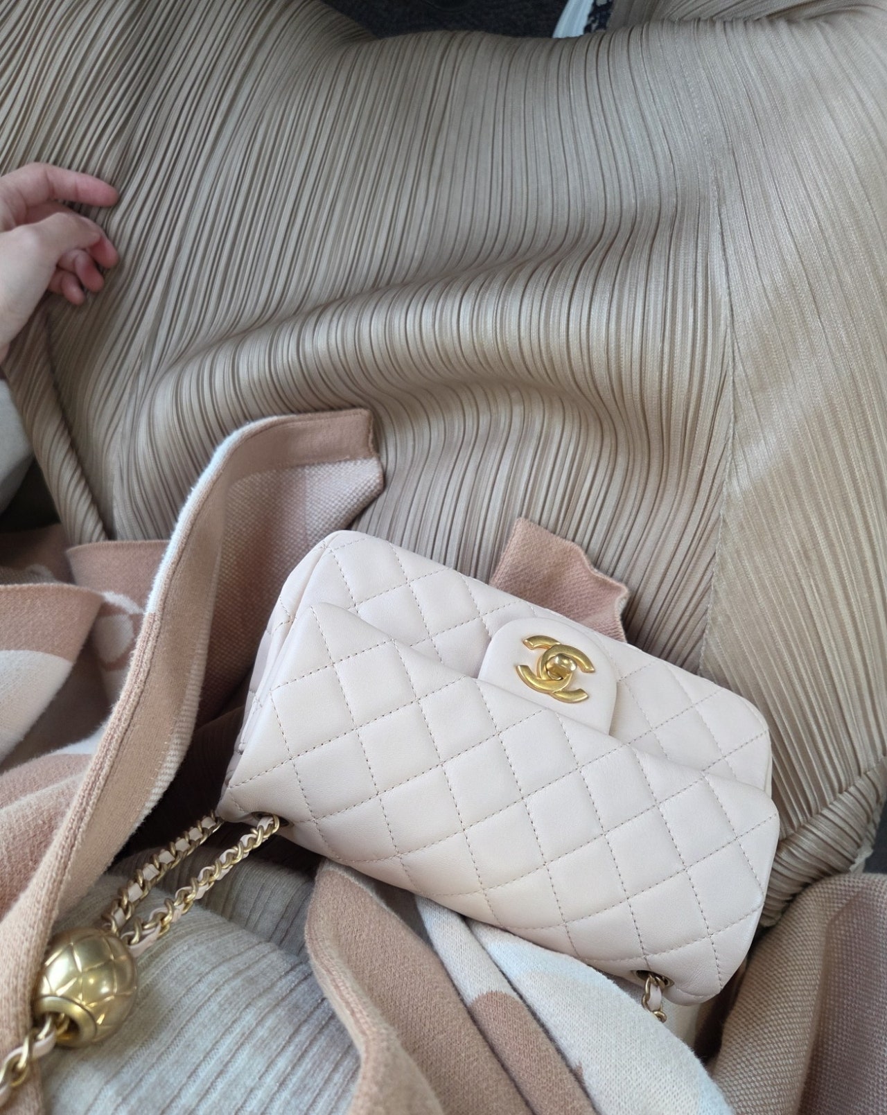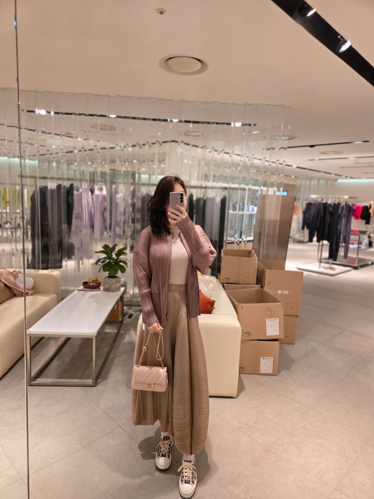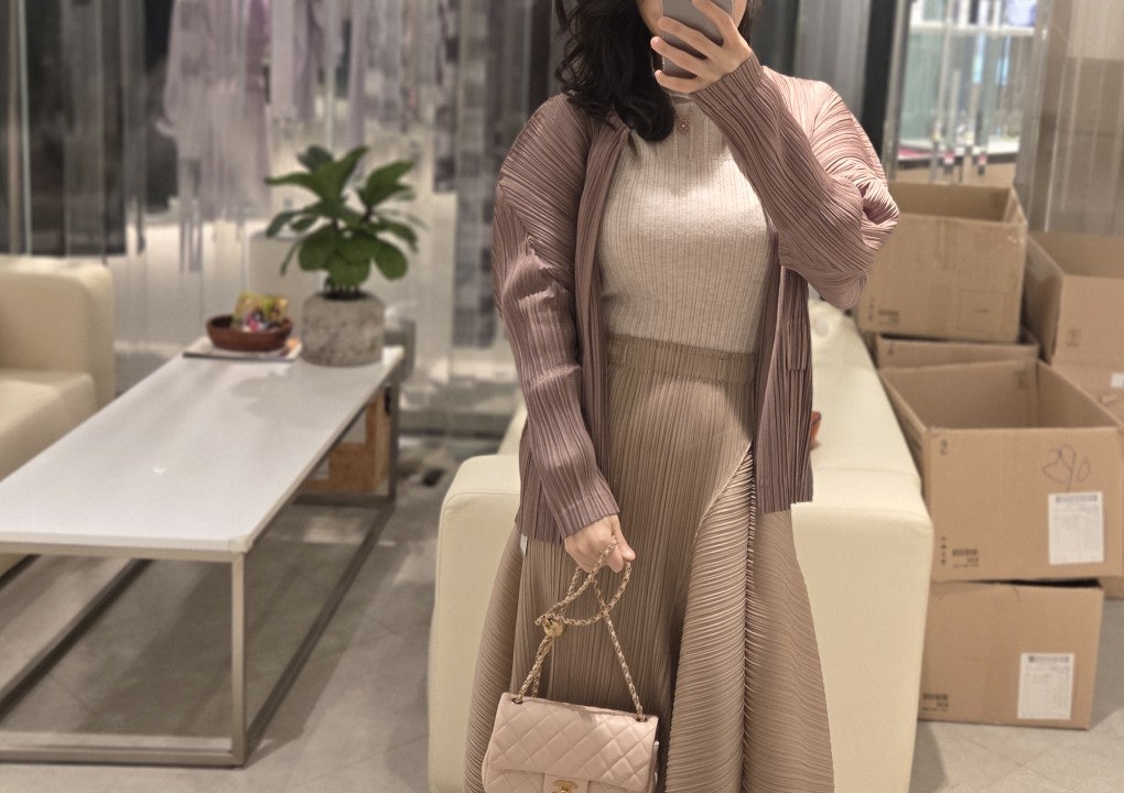실제 색감은 좀 더 핑크빛이 돌며 광택이 은은하게 느껴져서 오묘하기 그지없었어요. 오오티디였던 플리츠스커트와 찰떡이라며 매니저님께서 주인을 기다리고 있던 옷 같다고 하셨답니다.