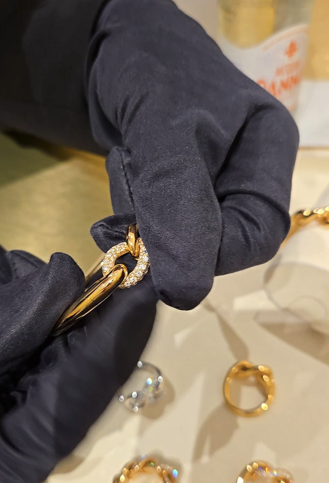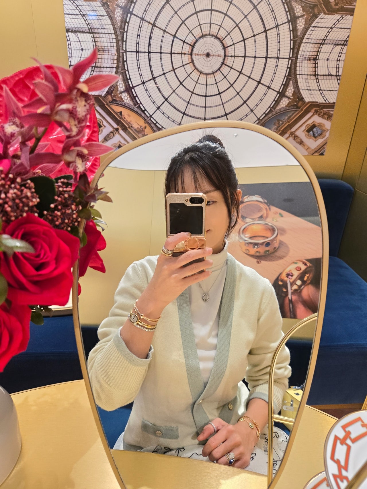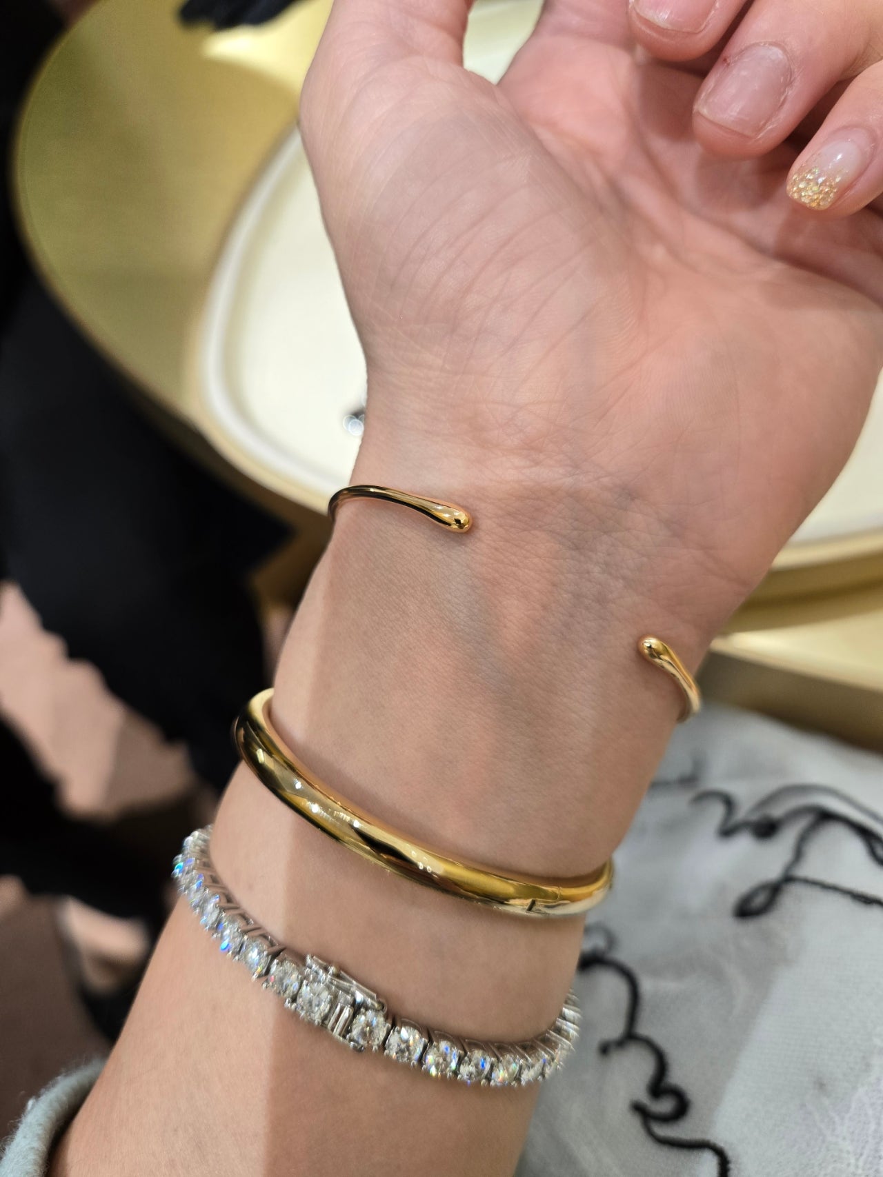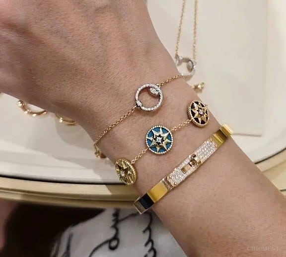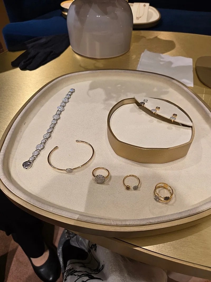 ​사비아 뱅글과 파베 브레이슬릿의 조합은 눈이 부실 정도로 반짝였어요.