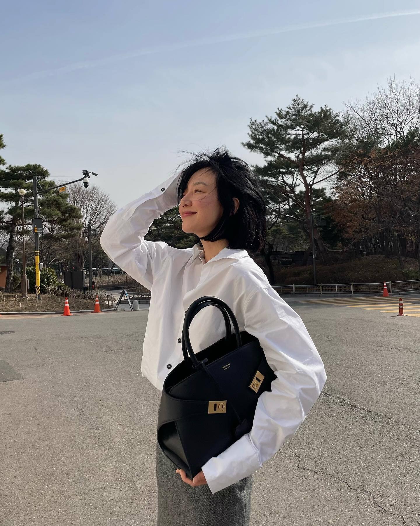 화이트 셔츠에 그레이 치마바지를 매치한 모던한 오피스룩에, 클래식한 디자인의 페라가모 백을 더해 우아한 분위기를 자아냈는데요.