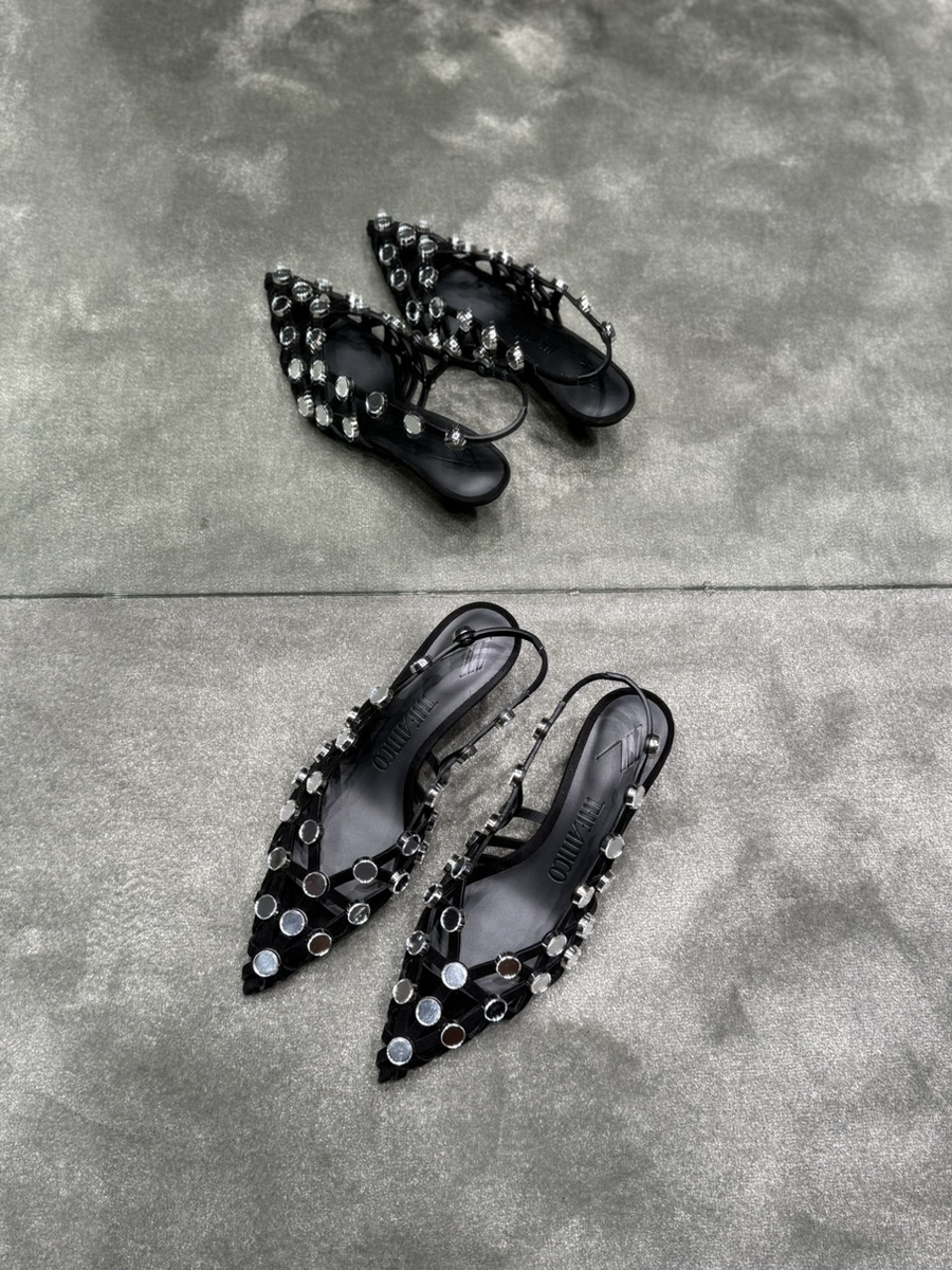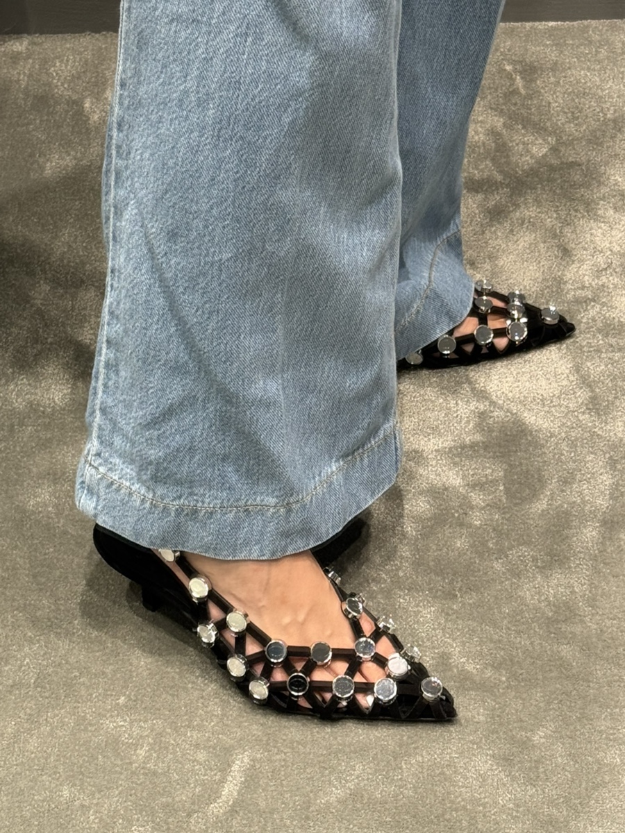 머스타드 티셔츠와 청바지랑 매치하니 캐쥬얼한 분위기의 룩이 연출되고 함께 신어본 그리드 블랙 슬링백은 은근히 시크한 매력이 있더라고요.