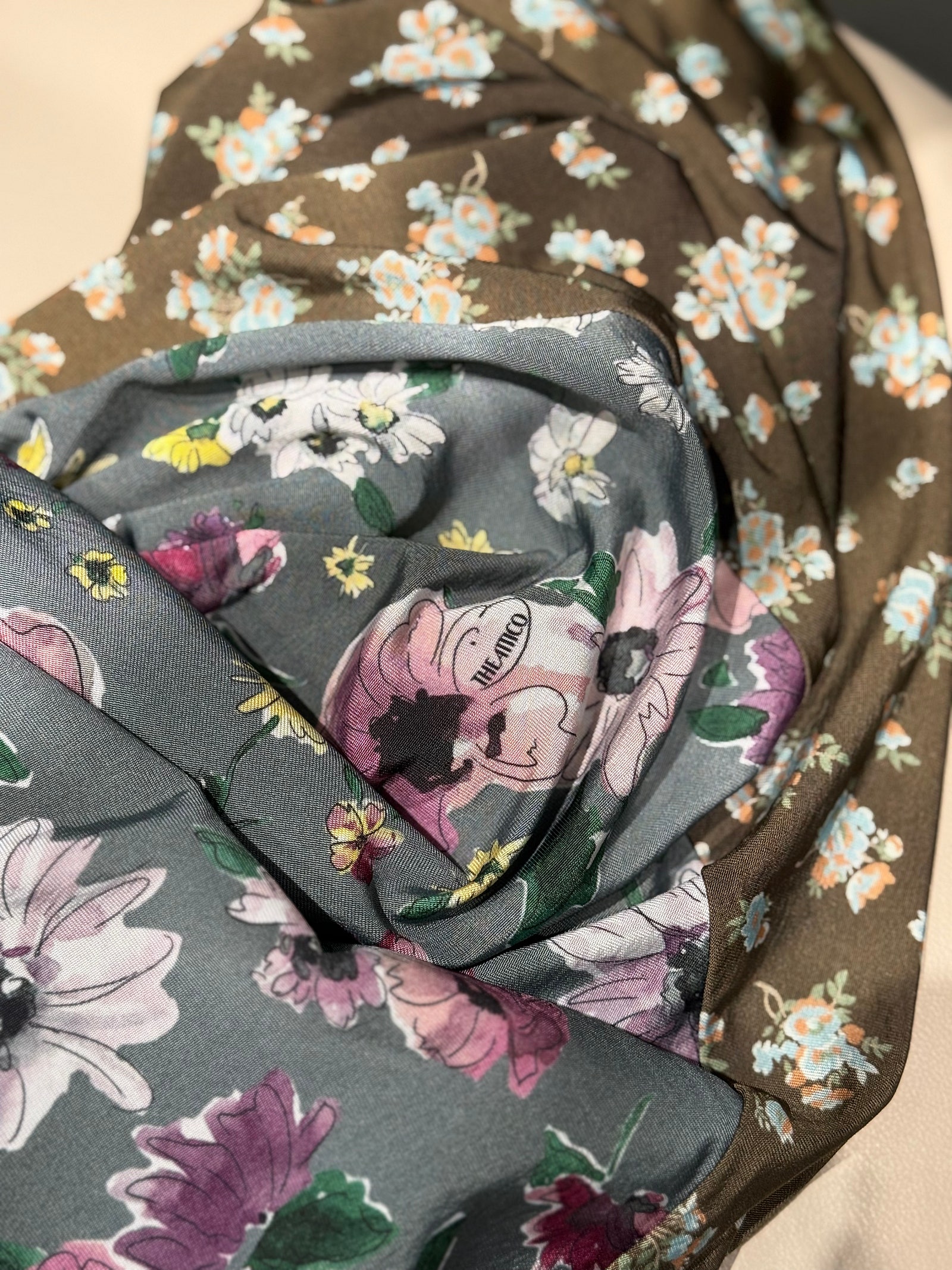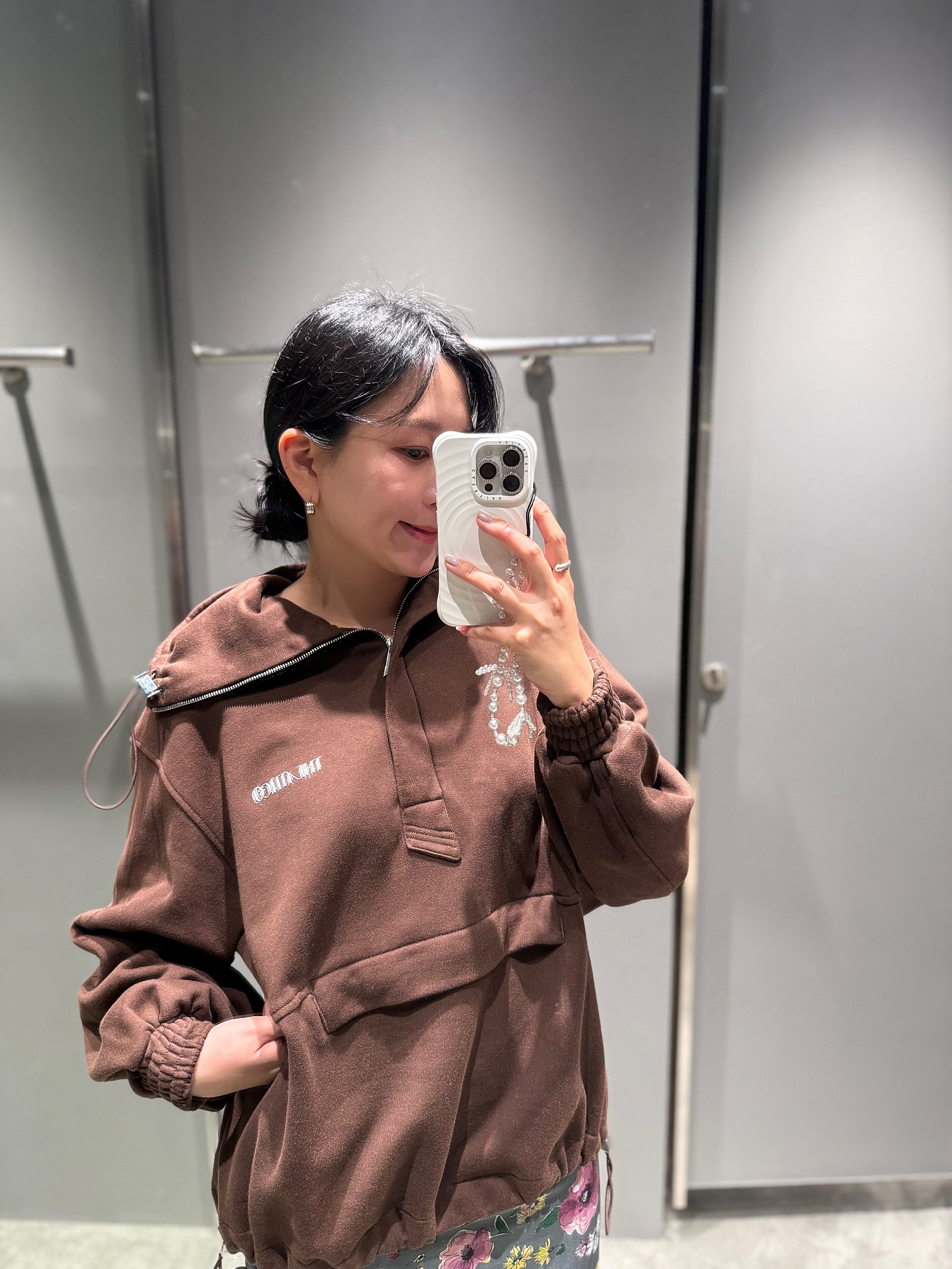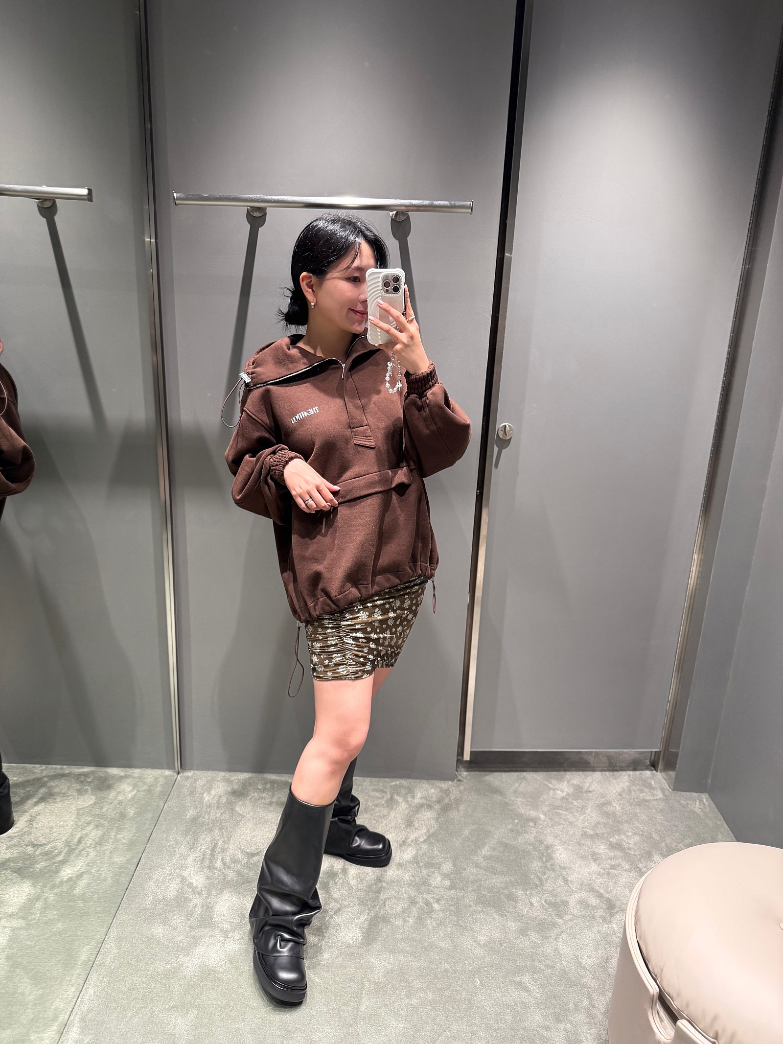 편안한 브라운 후드에 화려한 플라워 패턴 스커트를 매치해 봤어요.