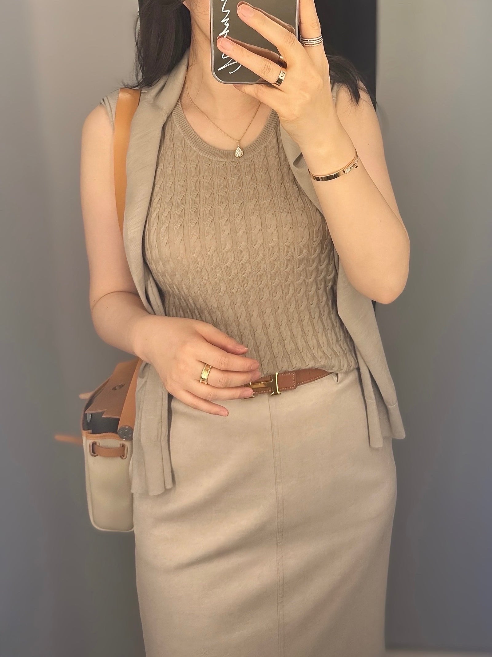 슬리브리스 탑만 입을 때는 실내 에어컨 바람 때문에 얇은 울 니트 걸쳐주면 좋더라구요!