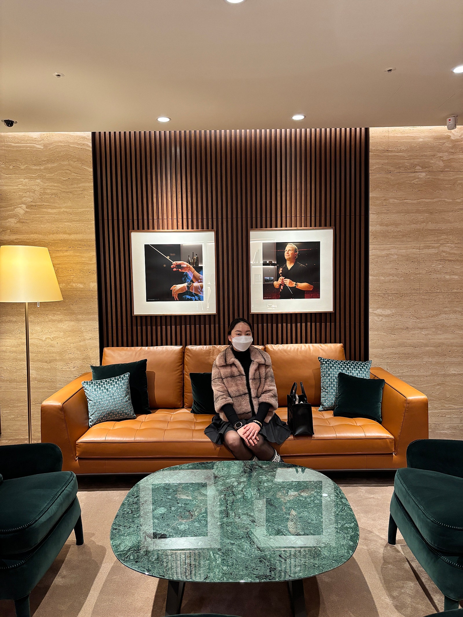 로 구성해 클래식한 공간 분위기와 잘 어울리는 따뜻한 겨울 코디로 맞췄습니다.