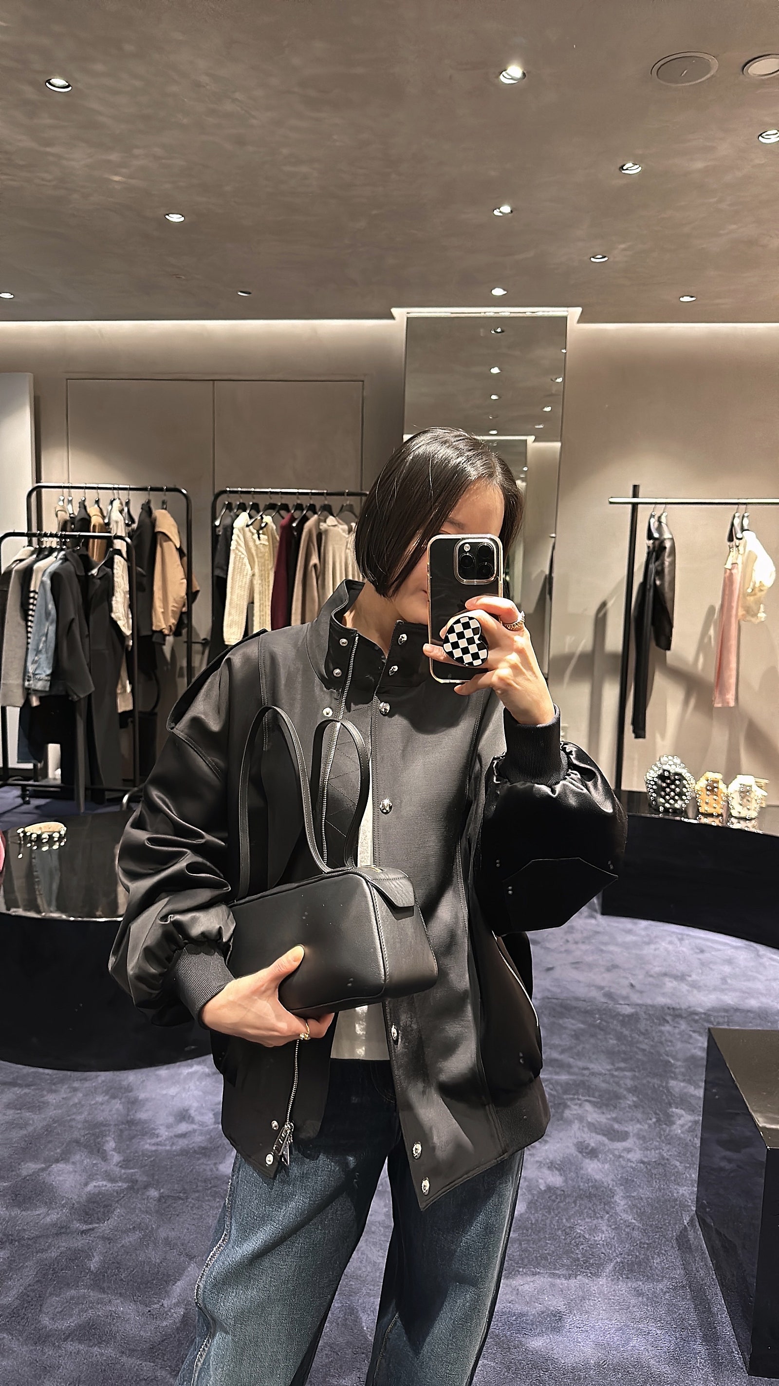 샤이니한 사틴 소재로 어깨 견장, 양방향 지퍼, 스냅 버튼 잠금 디테일이 특징적이었어요.
