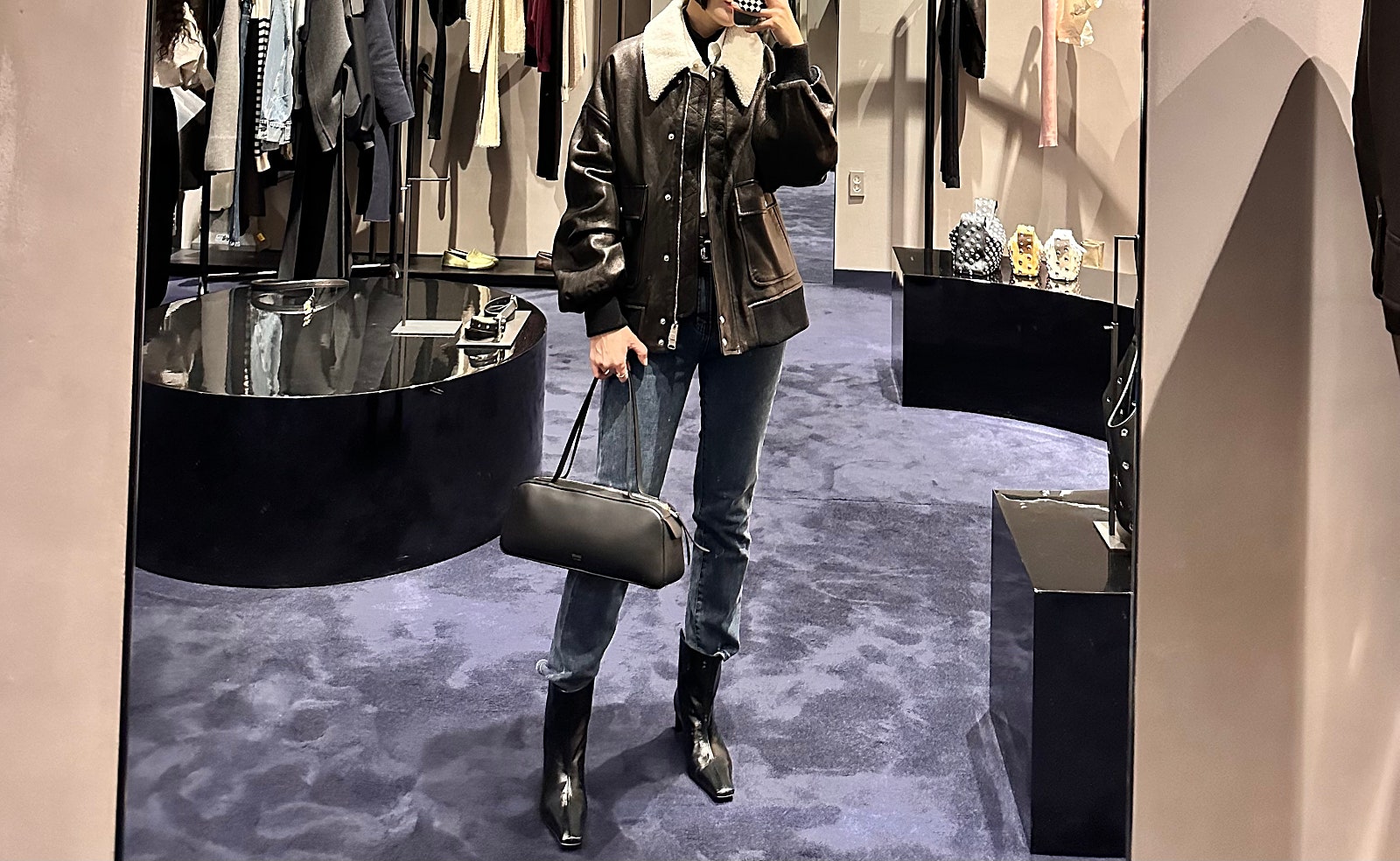 펀칭 디테일이 들어간 로터스 백(Lotus Tote Bag)을 같이 코디해 주니 엣지 있는 룩이 완성되었어요.