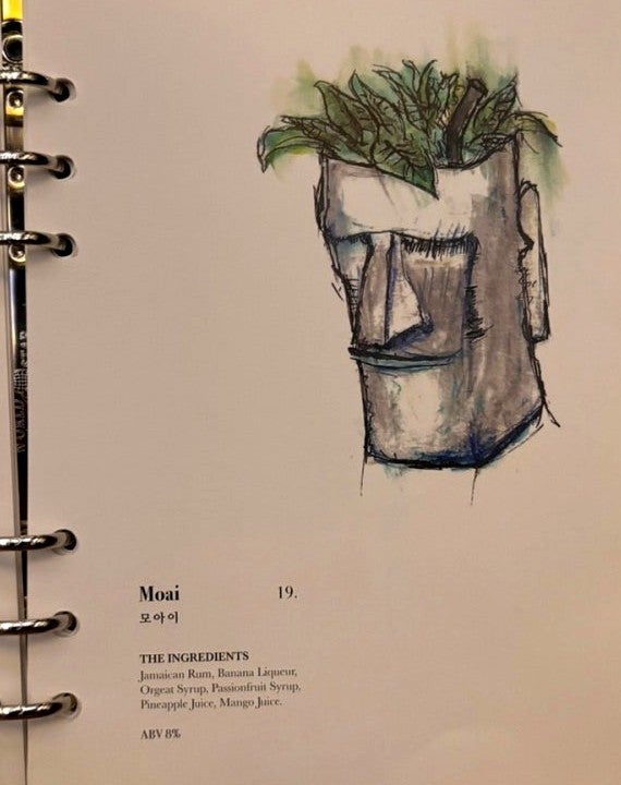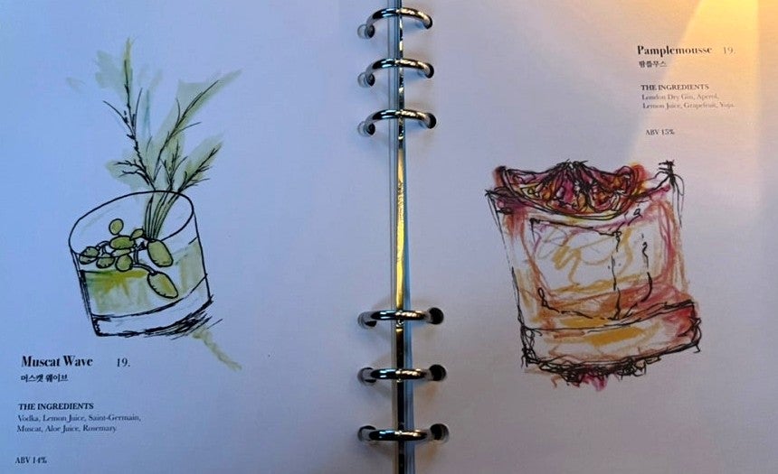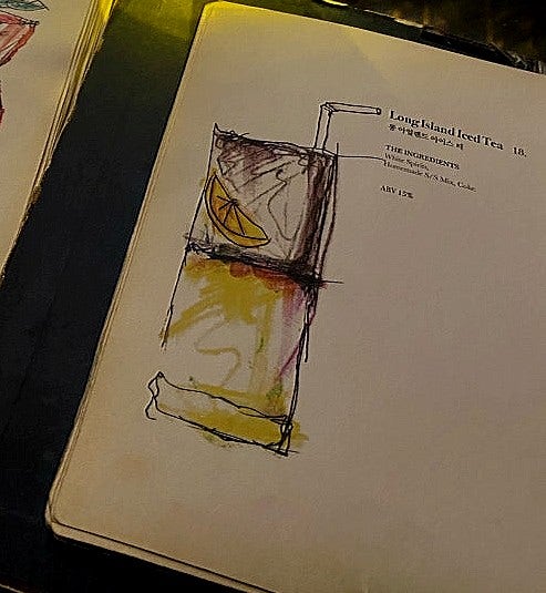 더불어 인상 깊었던 차별화 포인트는 메뉴판이었는데요. 칵테일을 메인으로 내세우는 바답게, 각 칵테일의 비주얼이 정교한 소묘로 담겨 있었고, 알코올 도수까지 함께 표기되어 있어 선택에 큰 도움이 되었죠.