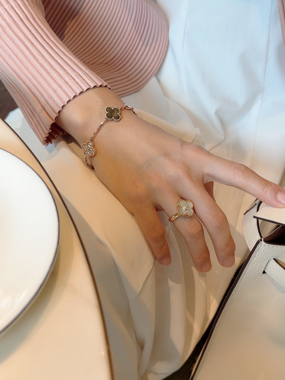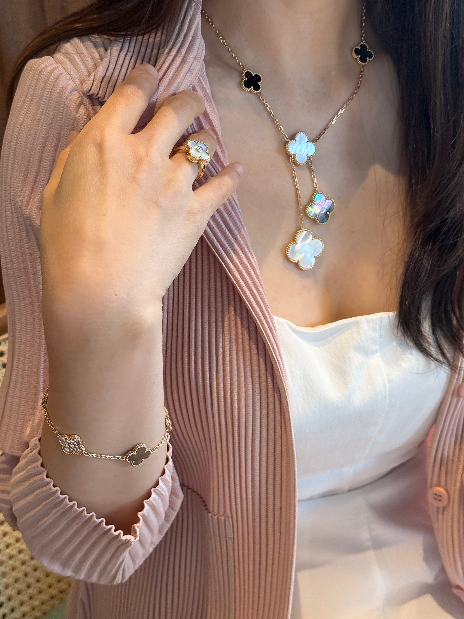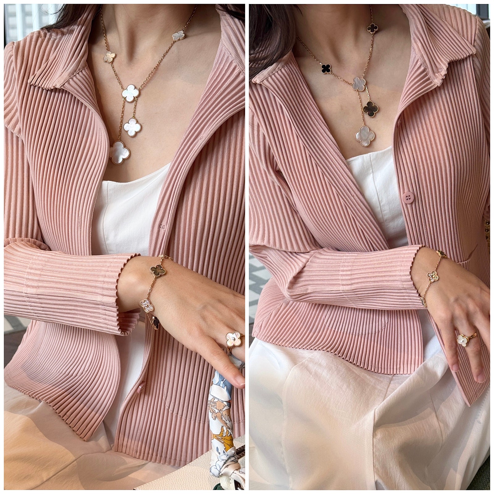 Van Cleef & Arpels Magic Alhambra 6-Motif Necklace and Bracelet: A Color Comparison (feat. my own pleated cardigan OOTD - yes, I bought it!)