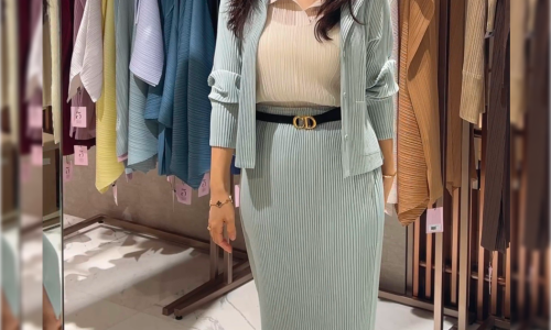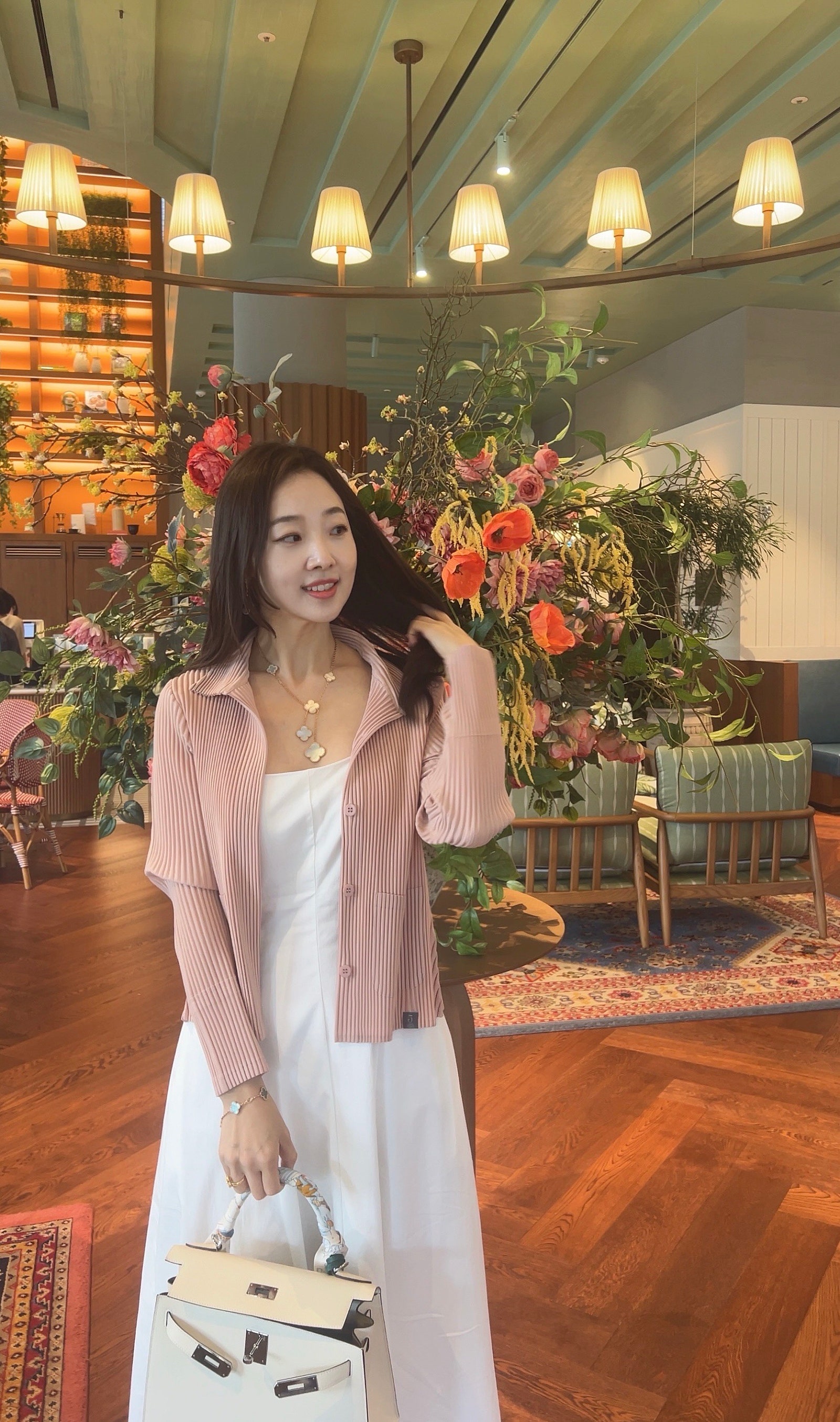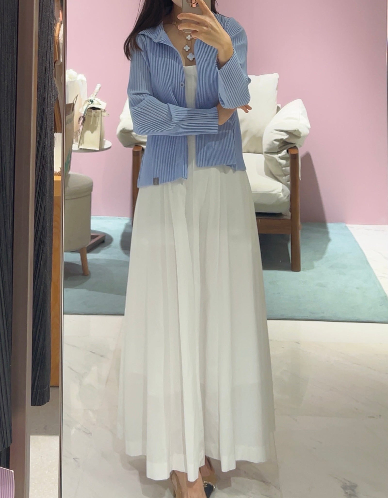민소매 화이트 플레어 원피스에 핑크 플리츠가디건 입어봤어요^^