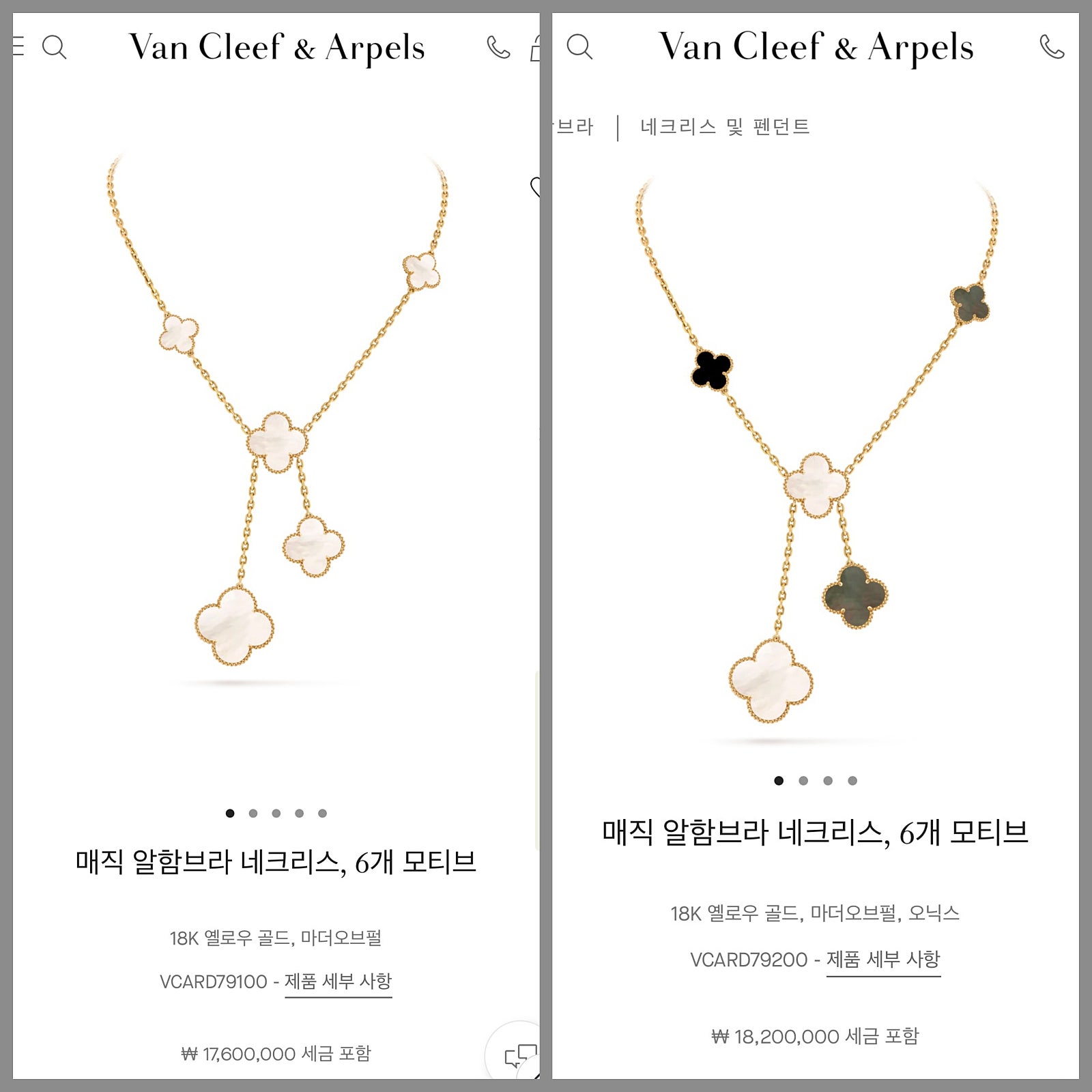 제가 가지고 있는 매직 알함브라 목걸이(마더오브펄 6 모티브), 그리고 친구가 최근에 구매한 오닉스가 같이 믹스되어 있는 제품 착용해 봤는데 느낌이 확 달랐어요.🤩