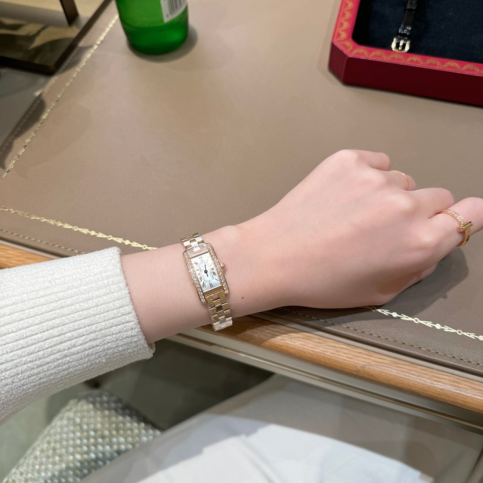 핑크 골드 브레이슬릿에 베젤에 다이아가 박힌 미니 사이즈의 탱크 아메리칸 워치이구요.