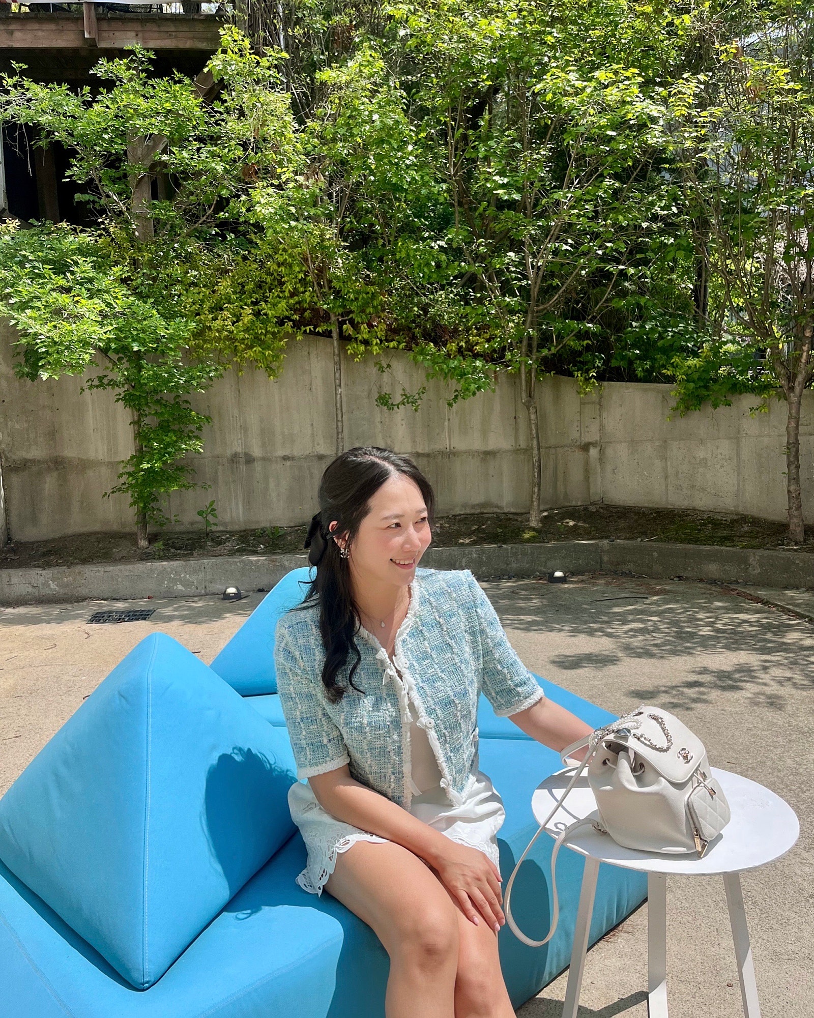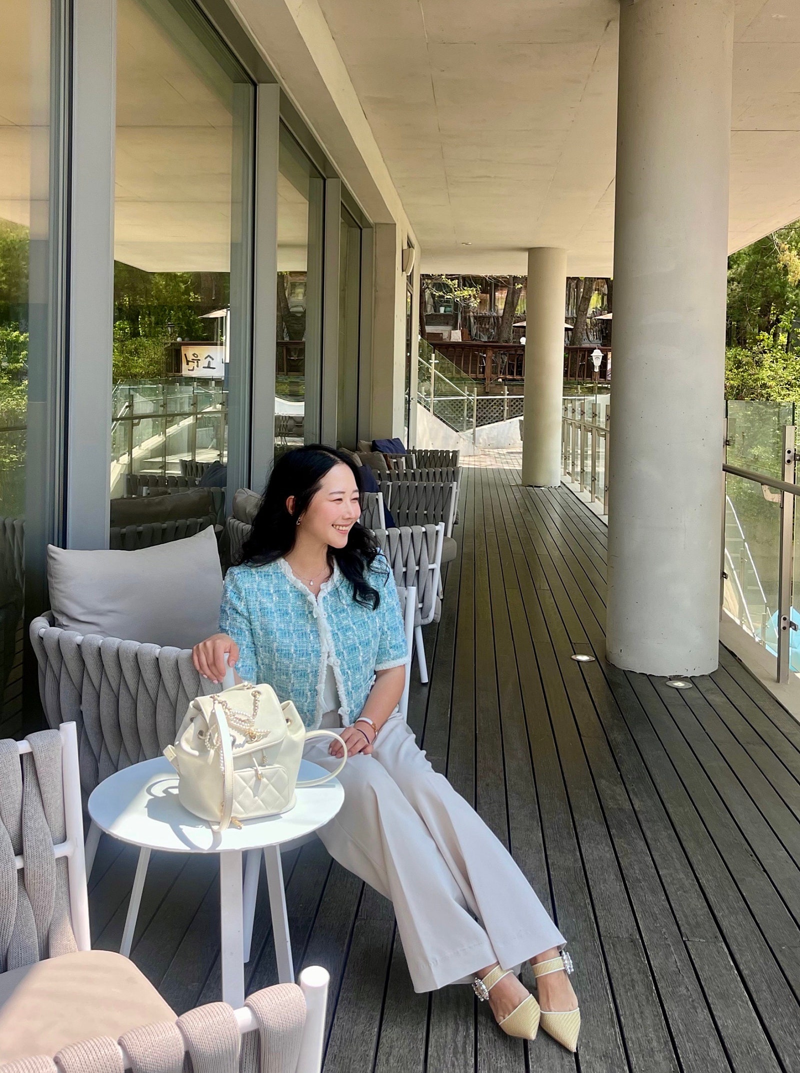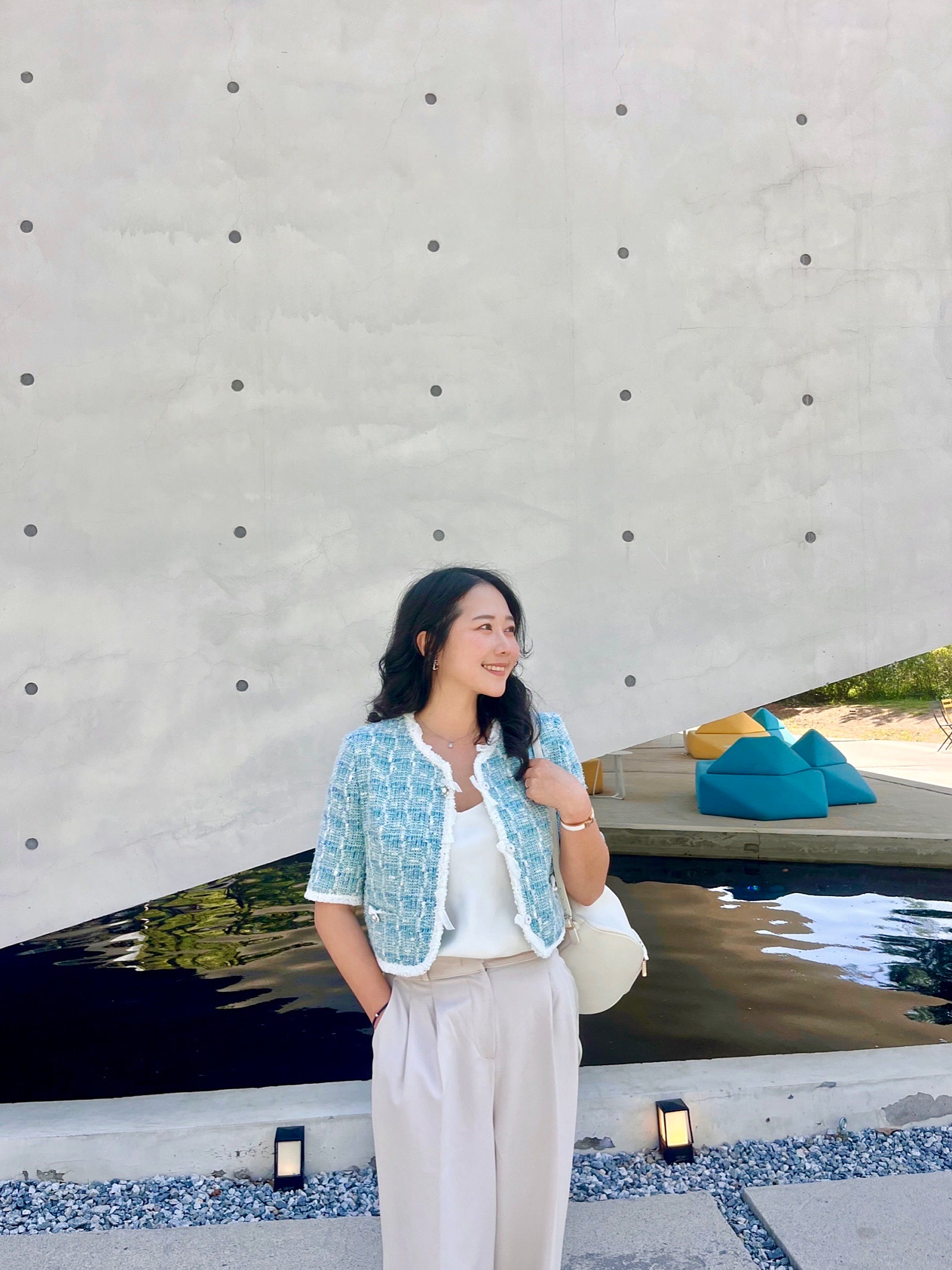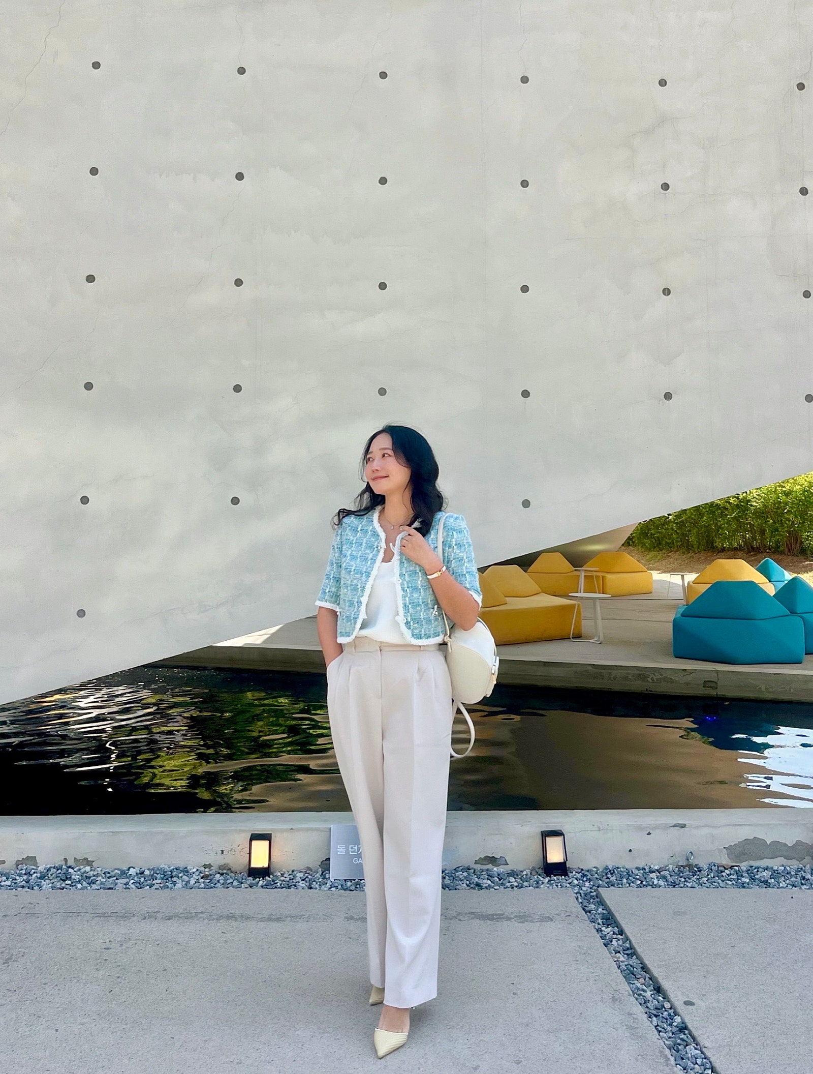 얼마 전에 인스파이어 리조트 다녀왔는데, 그때 미리 출시되었다면 찰떡이었을 마인 펄 & 리본 트리밍 트위드 자켓🩵🤍