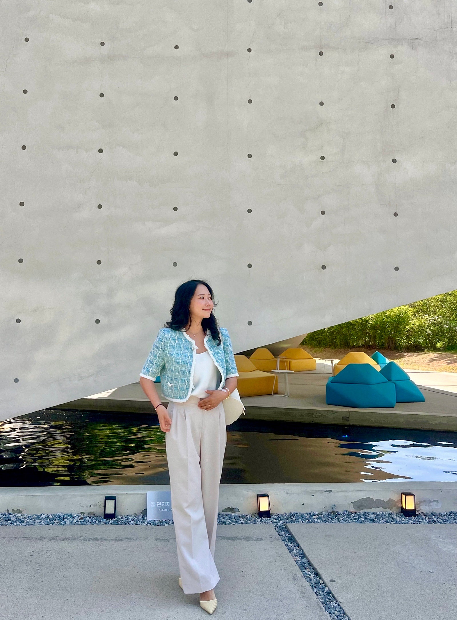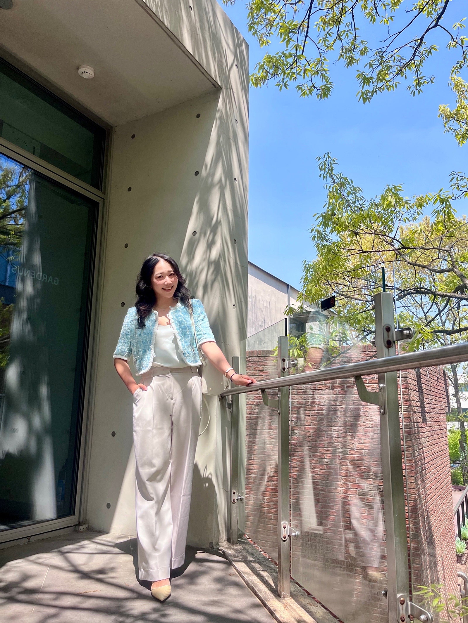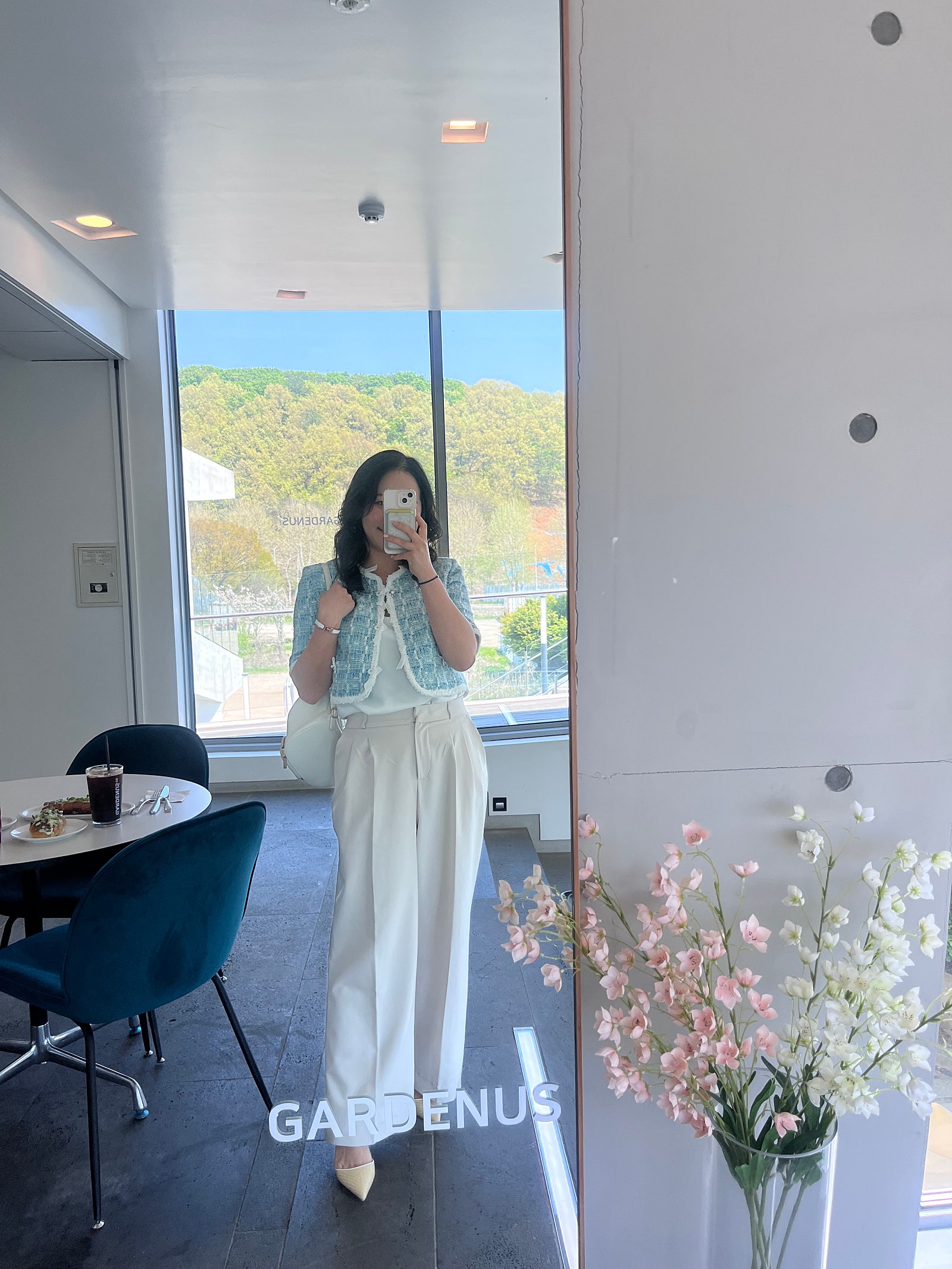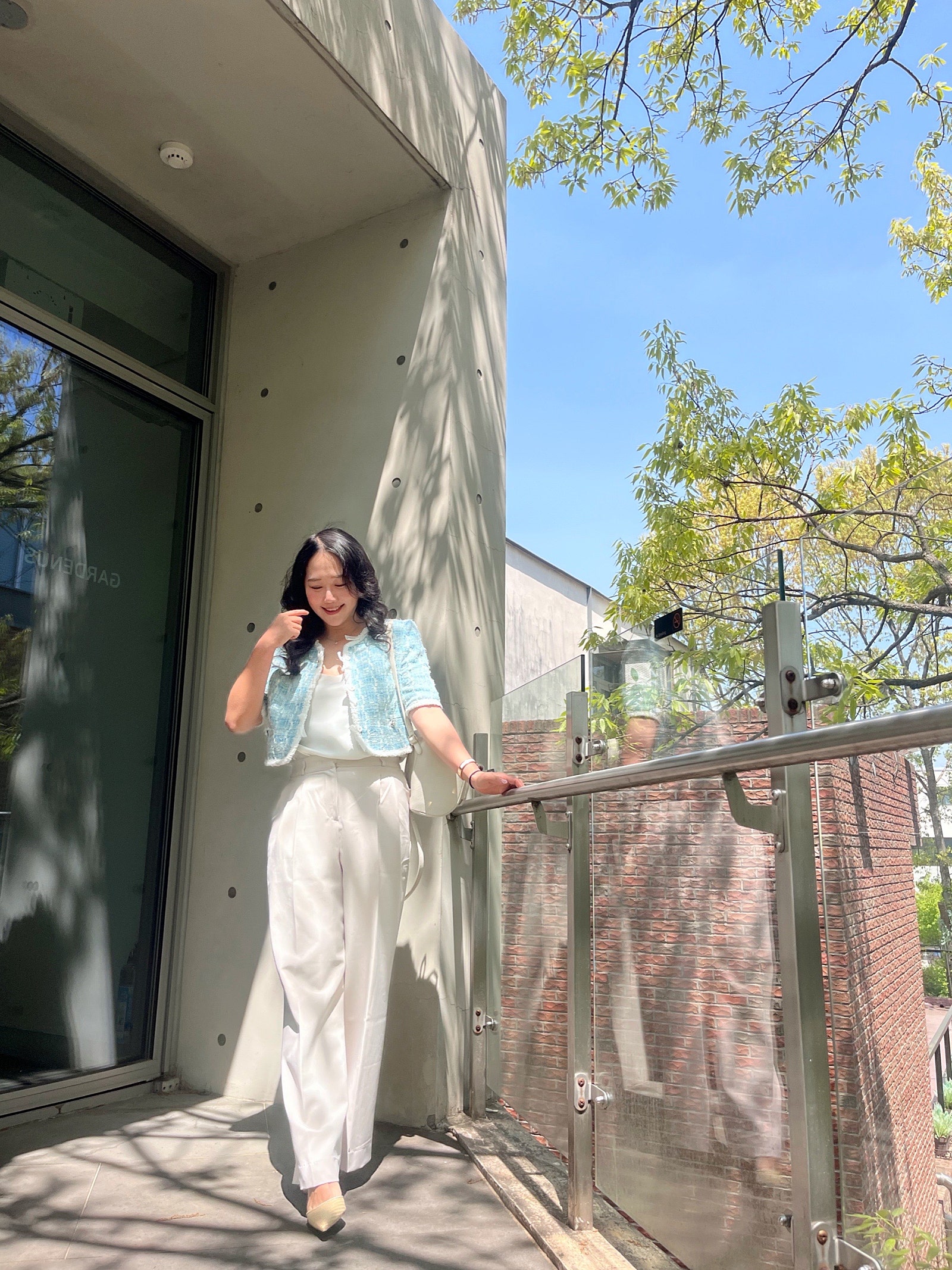 봄과 여름 사이라서 밝은 톤으로 코디했는데 그래서인지 오묘한 마인 자켓의 컬러가 더 청량해 보이고 이뻐 보이더라구요🩵