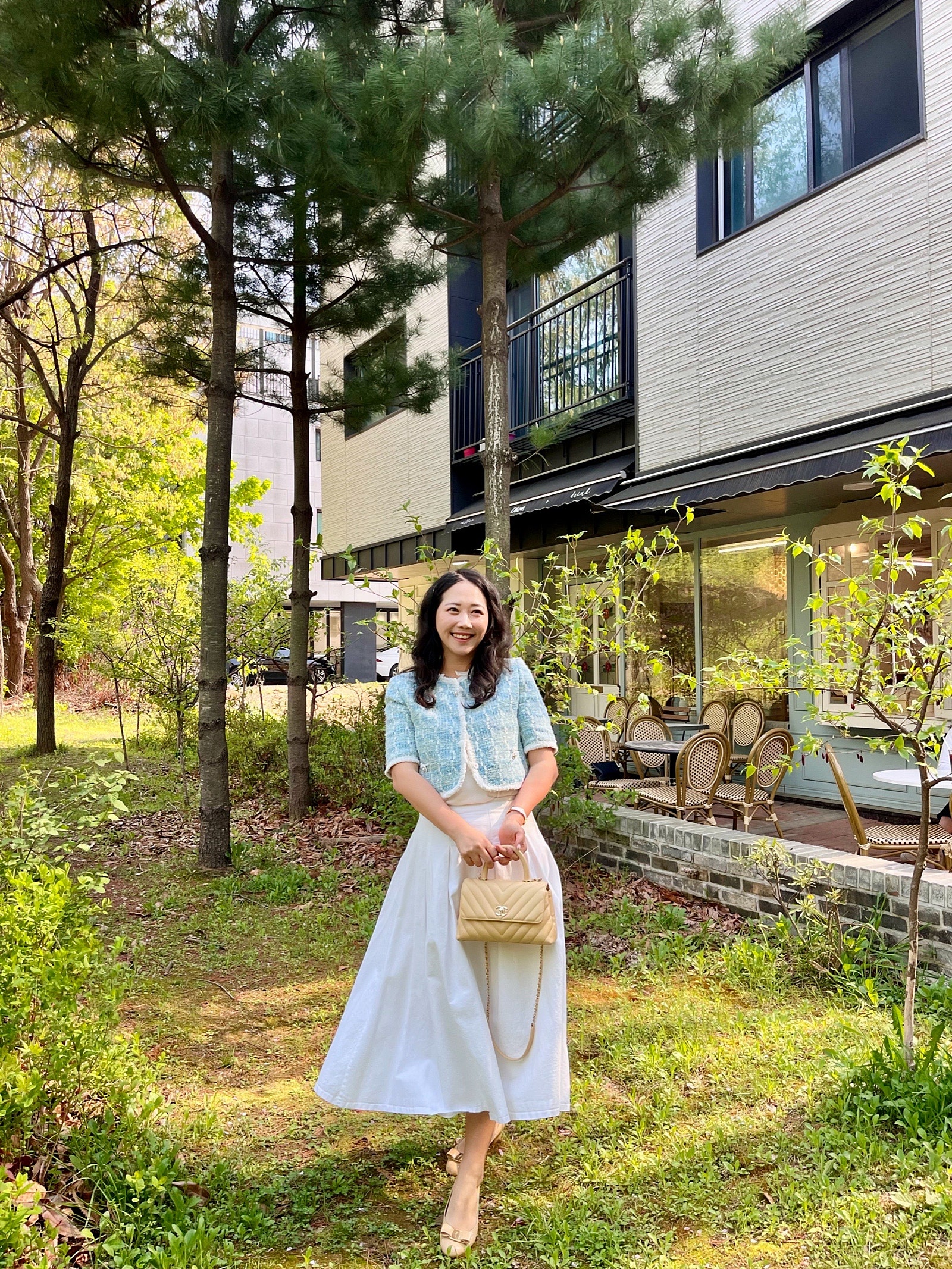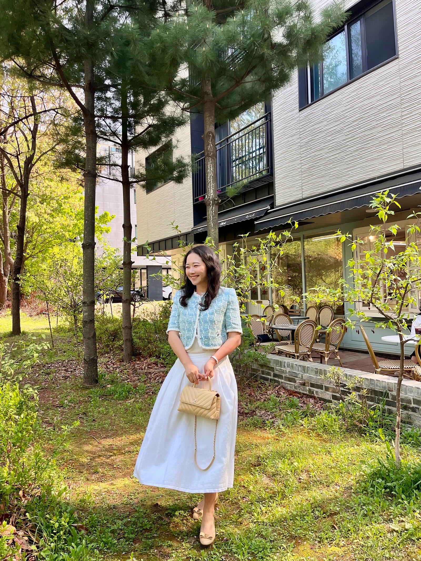 제가 즐겨 입는 화이트 풀 스커트에 마인 트위드 자켓 클로징해서 입으니 룩이 정말 우아해 보이고 아이랑 다니기에도 불편함 없이 좋더라구요!