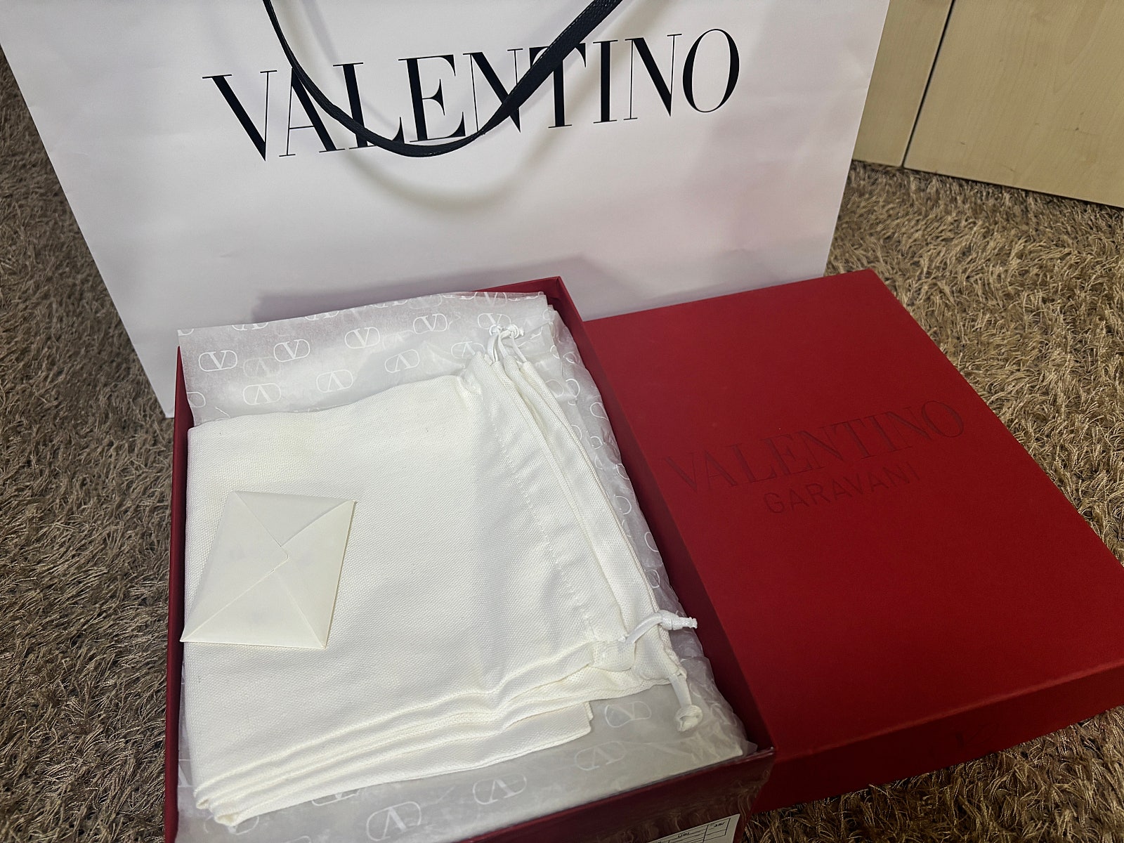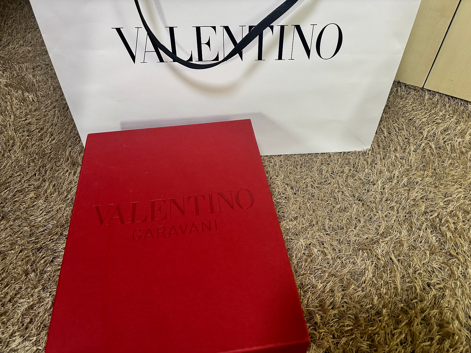 박스를 열면 더스트백과 정품 카드가 정갈하게 들어있고, 발렌티노 상징인 V 로고 패턴의 포장지가 또 한 번 만족감을 줘요.