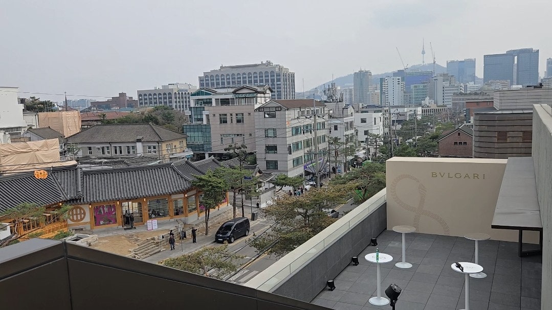 주변에 한국의 기와집에서 주는 동양미와 이탈리아 대표 주얼리 브랜드인 불가리의 조화.