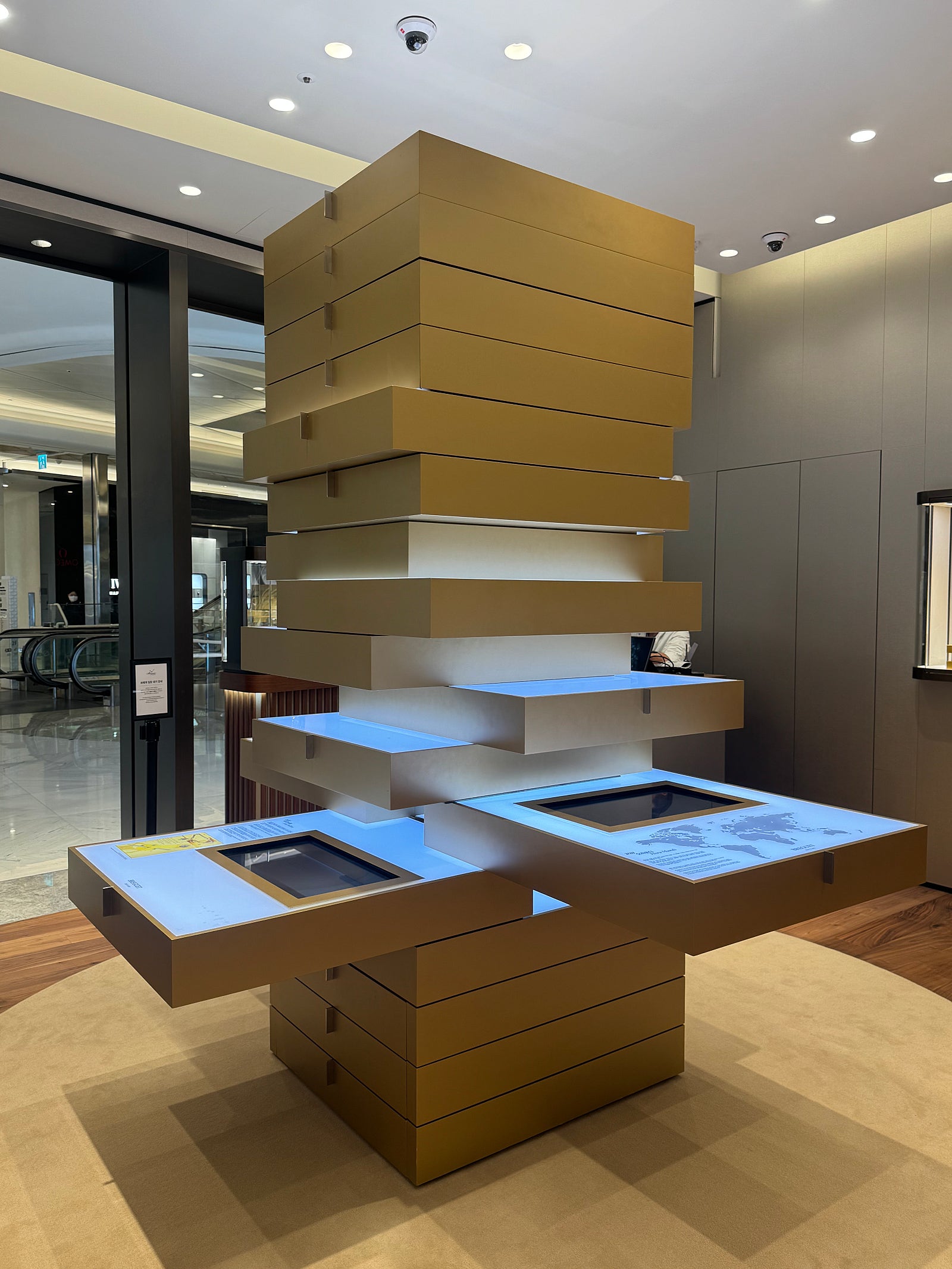 매장에 들어서자마자 입구에 바로 위치한 이 오브제는 여러 겹의 서랍이 쌓어있는 형태로 되어있는데, 서랍 하나하나에는 그동안 브레게가 쌓아온 기술의 역사가 서술되어 있어서 인상적이면서도 신기했어요!