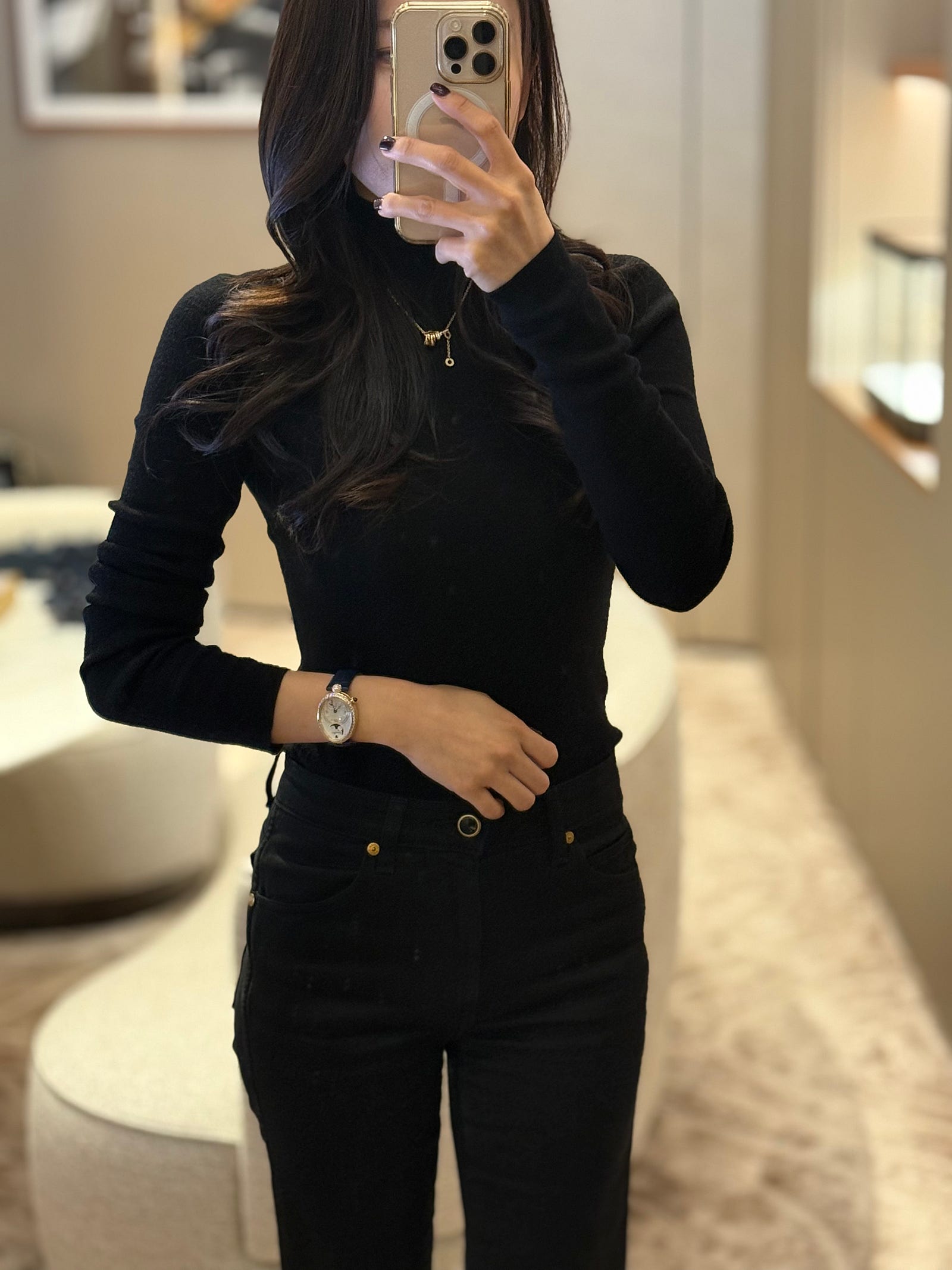 올블랙 룩에 뽀얀 자개 판이 참 우아하네요..!