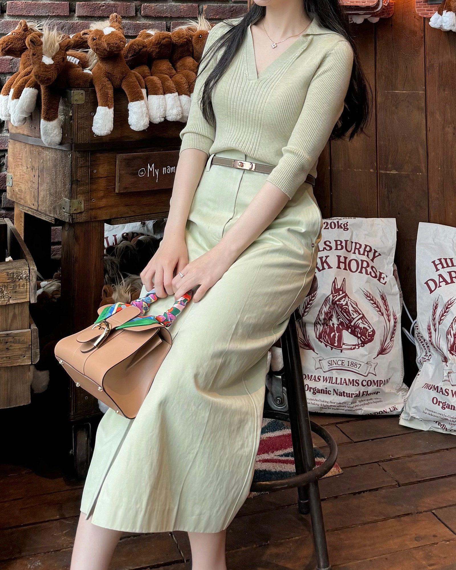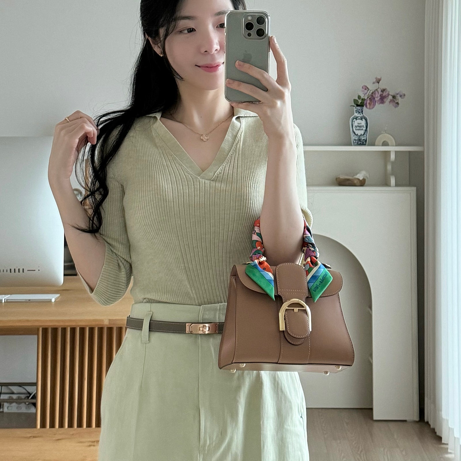브리앙에 스카프를 둘러 색감 포인트를 줬는데요. 톤 다운된 컬러감보다 이렇게 포인트 컬러가 많이 들어간 스카프가 가방에 둘렀을 때 더 예쁜 것 같아요.