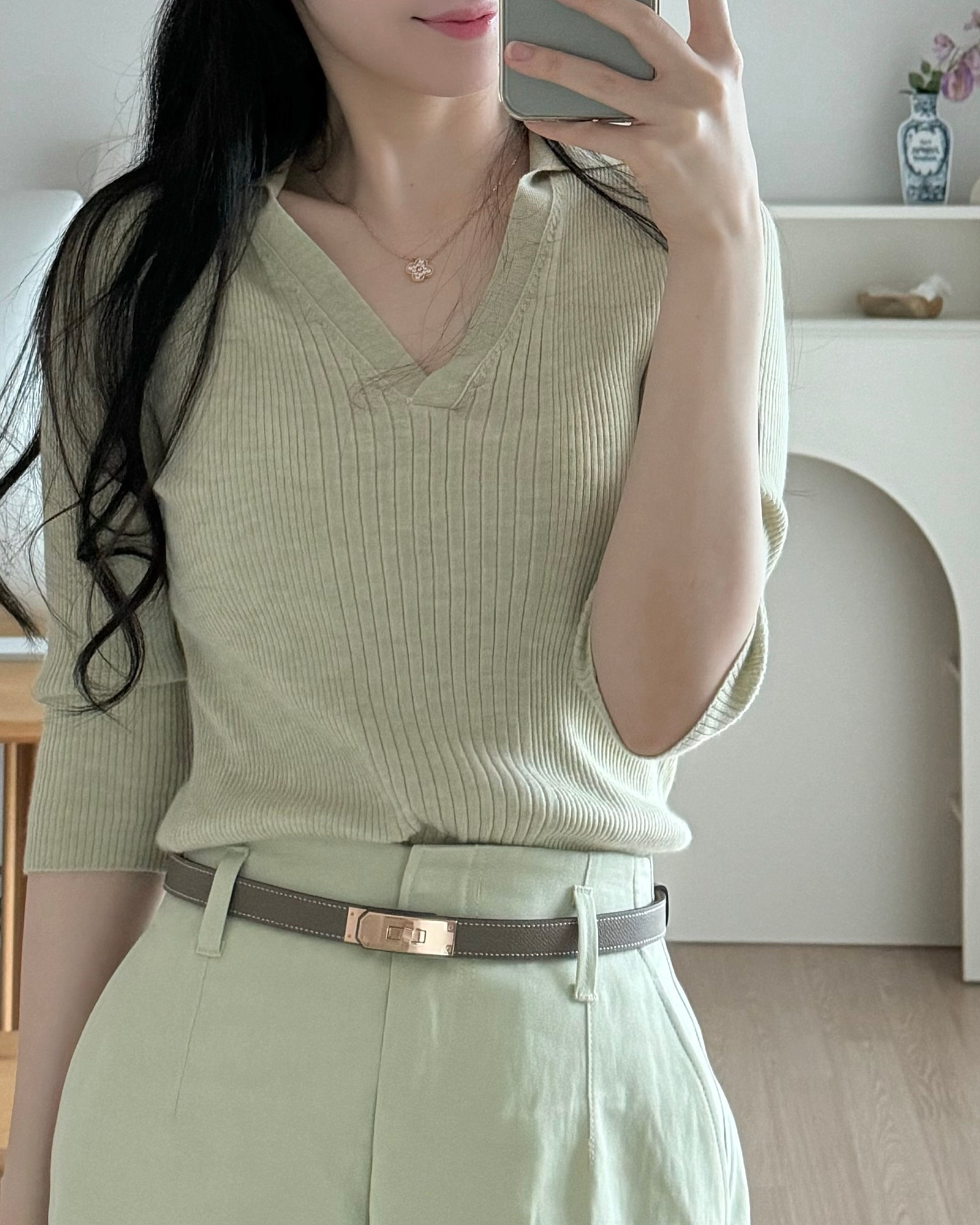 상의는 브이넥 디자인으로 시원해 보이는 니트에, 하의는 H 핏으로 떨어지는 단단한 질감의 롱스커트로 선택해 봤어요.