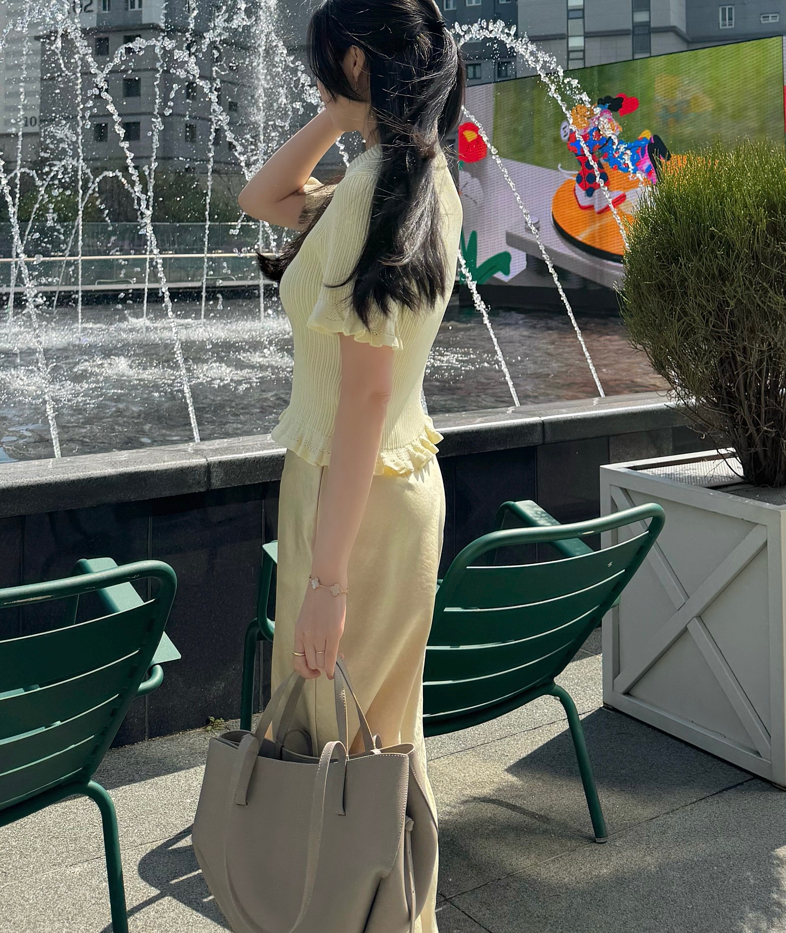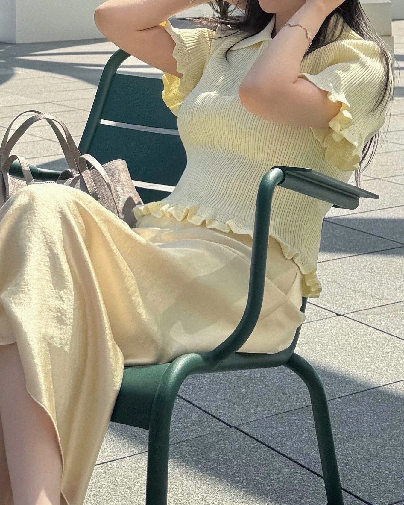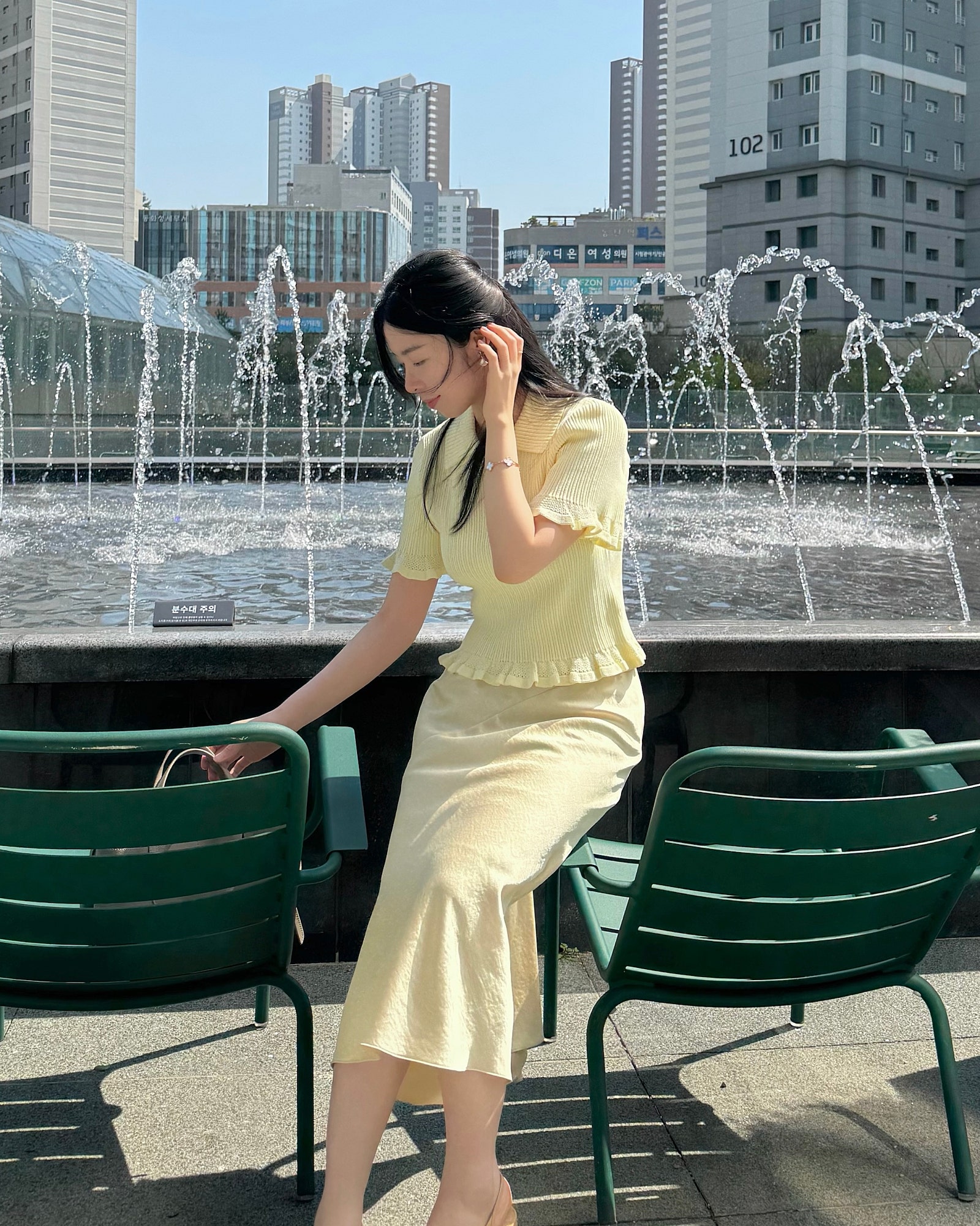 부드럽고 따뜻한 느낌의 노란색 반팔 니트에 롱스커트를 매치해 봤는데요. 화사하면서도 은은한 분위기를 더해주는 조합이었어요.