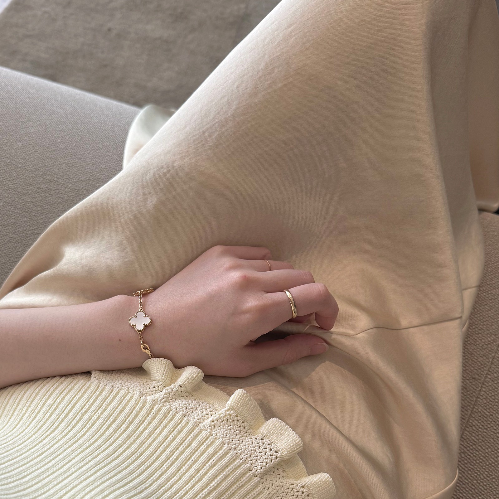 이날은 노란색의 따스함을 배가시켜주기 위해 골드 주얼리를 착용했는데요. 저의 애정템인 반클리프 5 모티브 팔찌..