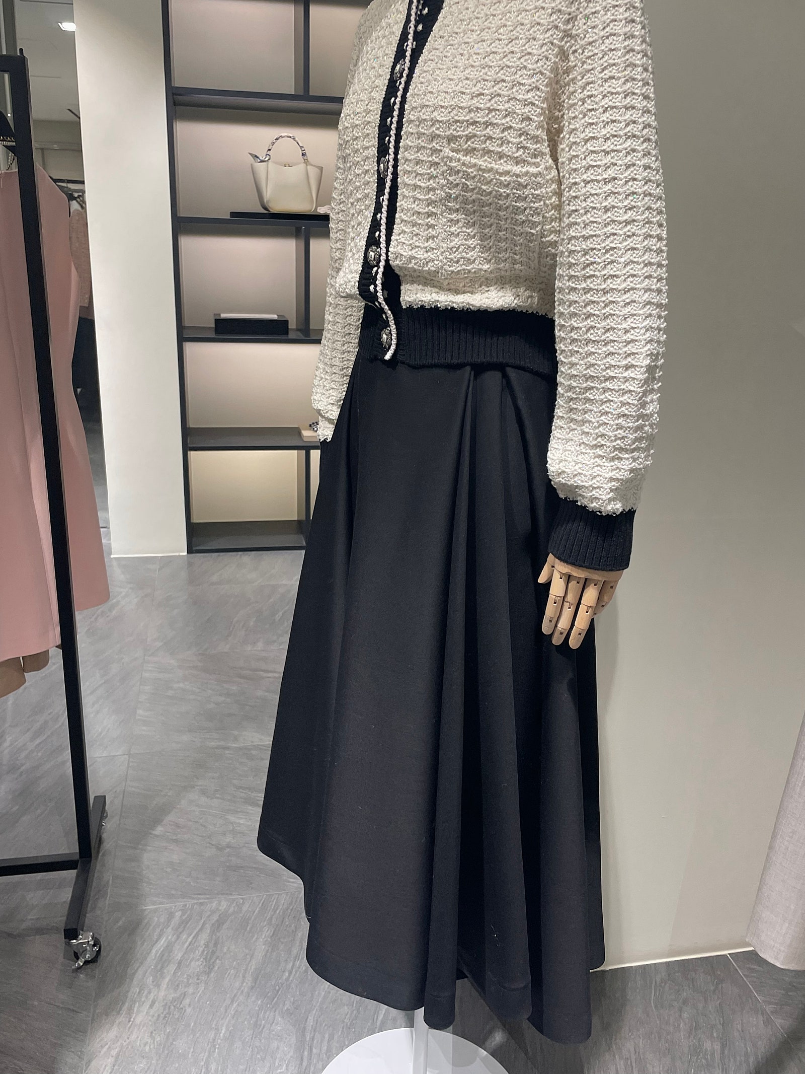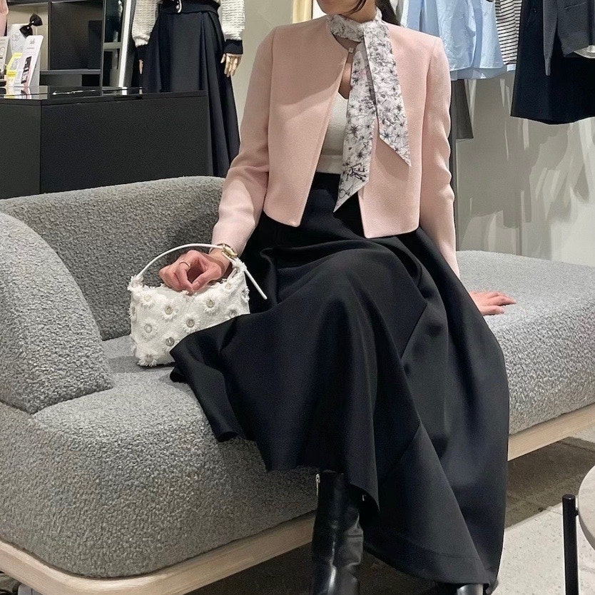 화사한 핑크컬러 재킷과 매치했을 때는 고급스러운 하객 룩 끝판왕 느낌이었다면 시크한 블랙 트위드 재킷과 코디했을 때는 조금 더 무게감 있는 세레모니 룩으로 만능 활용 가능해요.