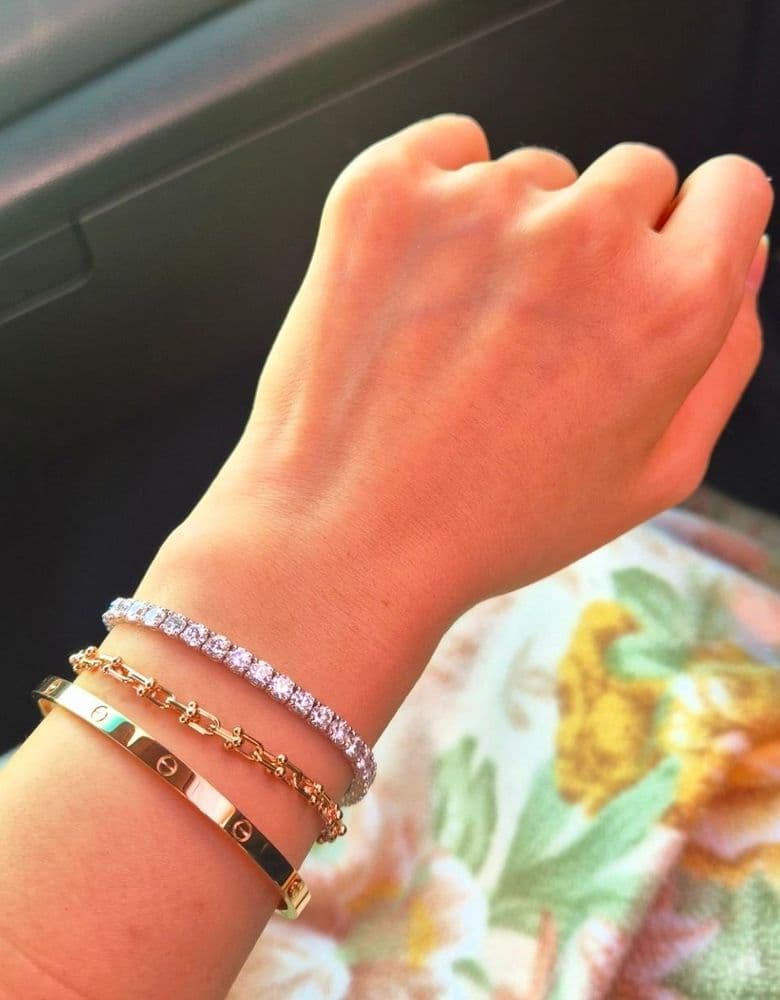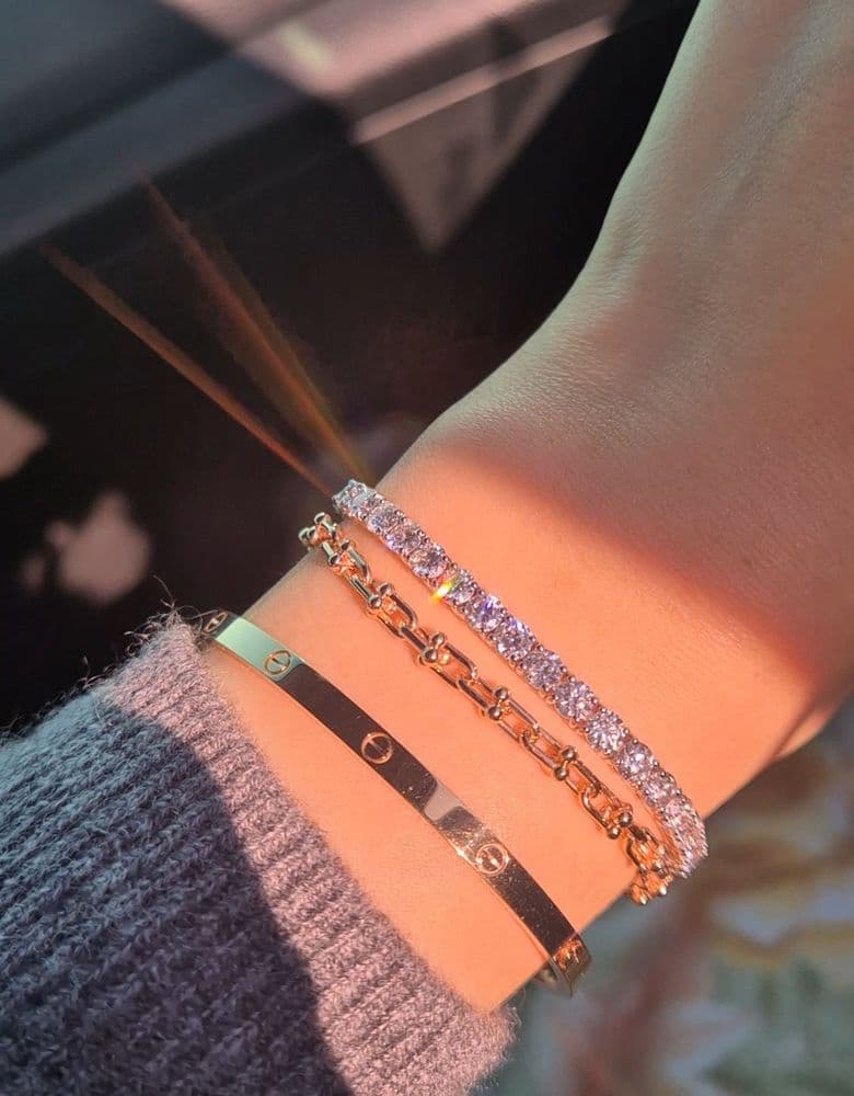 ✔️ 구매일&방문일&장소&가격 2026년2월/압구정 갤러리아/565만원 인상 직전에 예약하고 방문해서 대기 없이 입장했고 마이크로/스몰 사이즈 팔찌, 그리고 마이크로 사이즈 목걸이까지 착용해보고 마이크로 사이즈 팔찌로 최종 결정했어요. (목걸이는 예쁘긴 한데 금액에 비해 엄청 와닿는 느낌은 안들더라구요./하단 영상 첨부) 스몰 사이즈 팔찌도 예쁘긴 했는데 레이어드 하기에는 제 팔목엔 좀 과한 느낌이 있어 마이크로 사이즈로 결정했고 길이는 스몰1개/미듐 재고 2개가 있어 컨디션 비교해 보고 구매할 수 있었어요. (스몰 길이도 좀 넉넉하긴 했으나 그래도 미듐 길이가 참처럼 할 수도 있어서 미듐으로 결정했어요. 하나는 제가 착용해본 제품이었고 다른 하나는 지퍼백에 들어 있는 새제품이라 2개 나란히 놓고 보니 지퍼백이 들어있던 제품이 확실히 기스도 없고 색상도 좀 더 맑은 로즈골드더라구요.) 저는 까르띠에 러브 팔찌 스몰 사이즈, 테니스 팔찌 2부와 같이 레이어드해서 착용했는데 레이어드 해도 예쁘고 링크 단독으로만 착용해도 여리여리해서 너무 예쁘더라고요. 아주 튀는 아이템은 아니지만 스테디로 은은하게 평생 쓸 수 있을 것 같아 만족합니다(하단 영상 첨부).