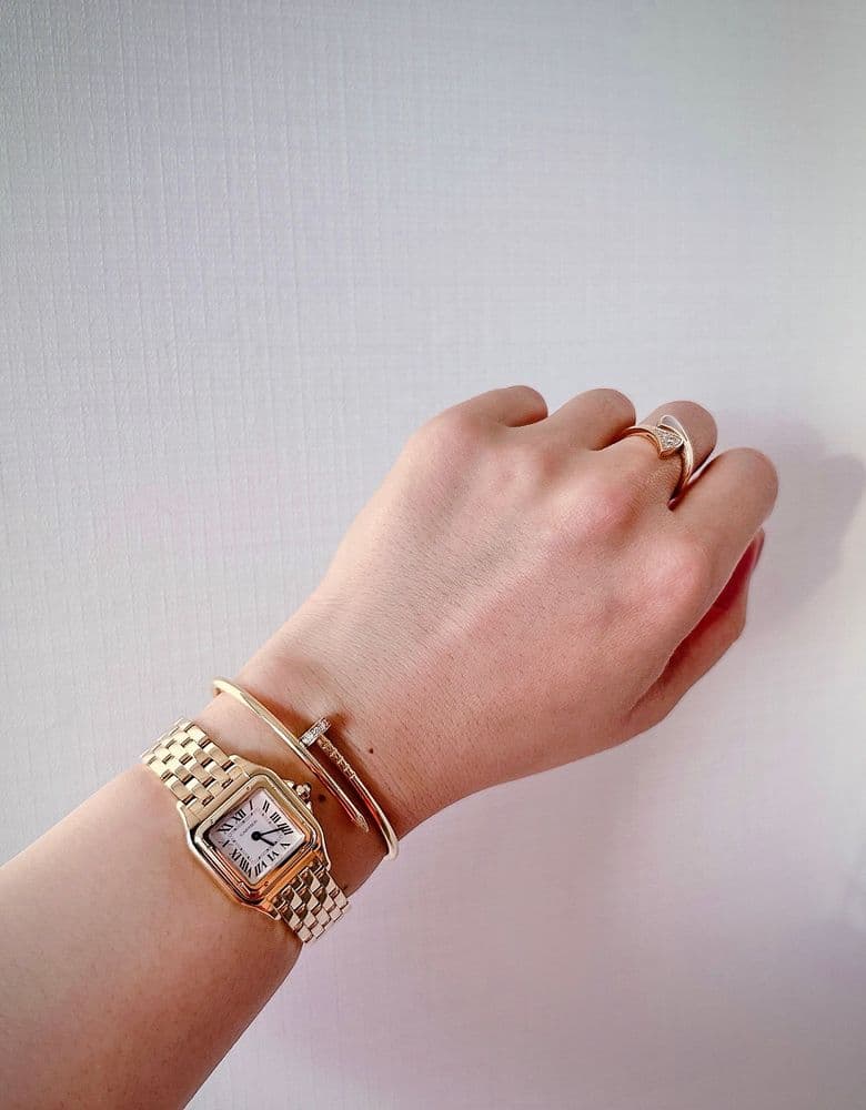 사실 베누아를 염두해두고 매장 방문했는데 너무 안 어울려서 조금 당황했어요 뱅글은 좀 나은데 스트랩은 뭐랄까.. 장난감시계 착용한 기분? 시계는 너무 이쁜데 제 손이 문제겠죠 ㅜㅜ 암튼 그러다가 팬더를 차봤는데 그냥 끝!! 스틸도 괜찮았지만 탱머 스틸로 샀고 지금은 가죽줄이지만 겹치는 거 같아서 금통으로 큰맘 먹고 샀어요 다행히 매장에 재고 있어서 구입했구요 모든 주얼리가 옐골이라 통일해서 옐골로 샀어요 살이 너무 쪄서 좀 끼긴하지만 살이 빠질거란 희망속에 일단 껴봅니다