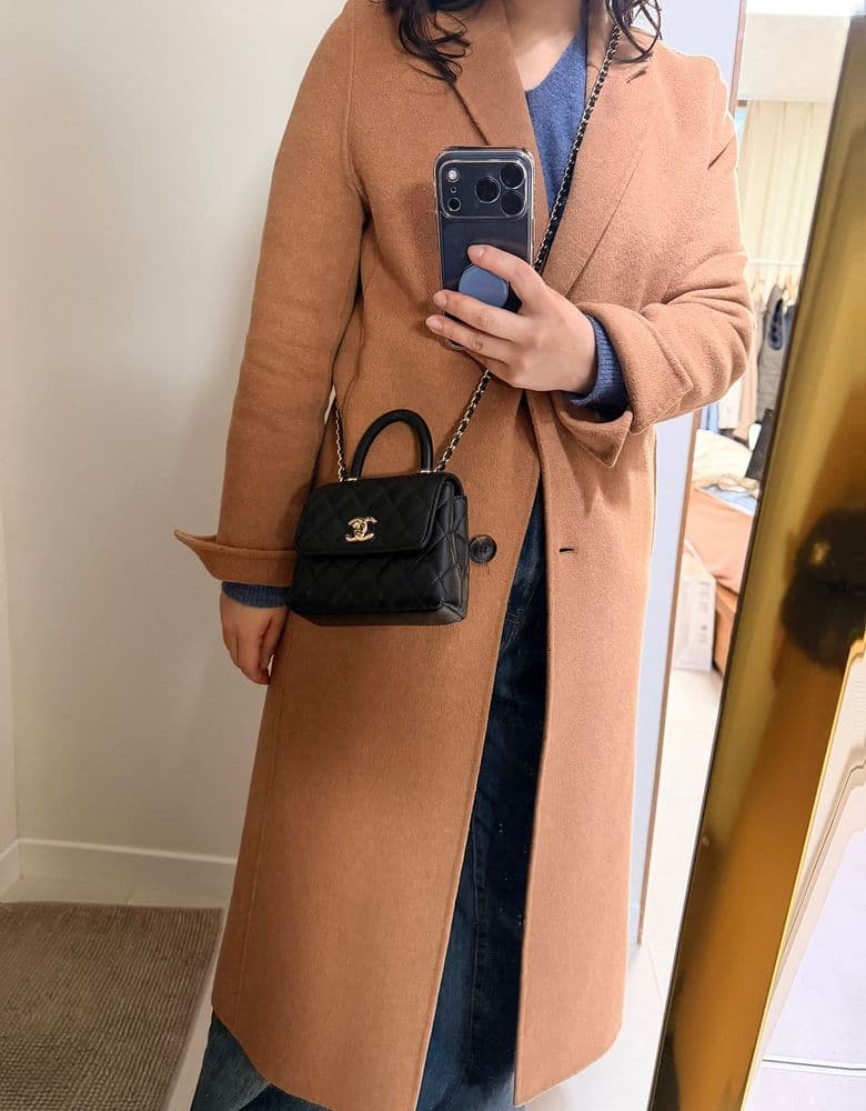 코코핸들 초미니, 마이크로, woc 등으로 불리우는 손바닥만한거 샀네요 ㅋㅋ 전 실물 보기 전에 사이즈 감이 안왔어서 혹시 고민중인 분들 참고하시라고 올려봅니다! 아이폰 안들어가고 차키(or 에어팟), 쿠션, 립 하나 넣으면 땡입니당 ㅋㅋ + 카드 슬롯 세개! 짐 적으신 분들에겐 생각보단 괜찮아요 155 기준 크로스로 길이 딱 좋고 끈 한번 감으면 숄더 길이도 되긴 해요 ㅎㅎ 작긴 한데 은근 아무 옷에나 어울려서 자주 맬 것 같습니다! 전 신강에서 구매했고 레트로 트위스트 초미니도 한점 있었어서 두개 중에 엄청 고민했네요 ㅜㅜ 레트로도 이쁜데 좀 뚱뚱하고 각져서 전 코핸이 더 이뻐 보이더라구용 (수납은 레트로가 좀더 좋고 가격은 둘이 비슷했어여)