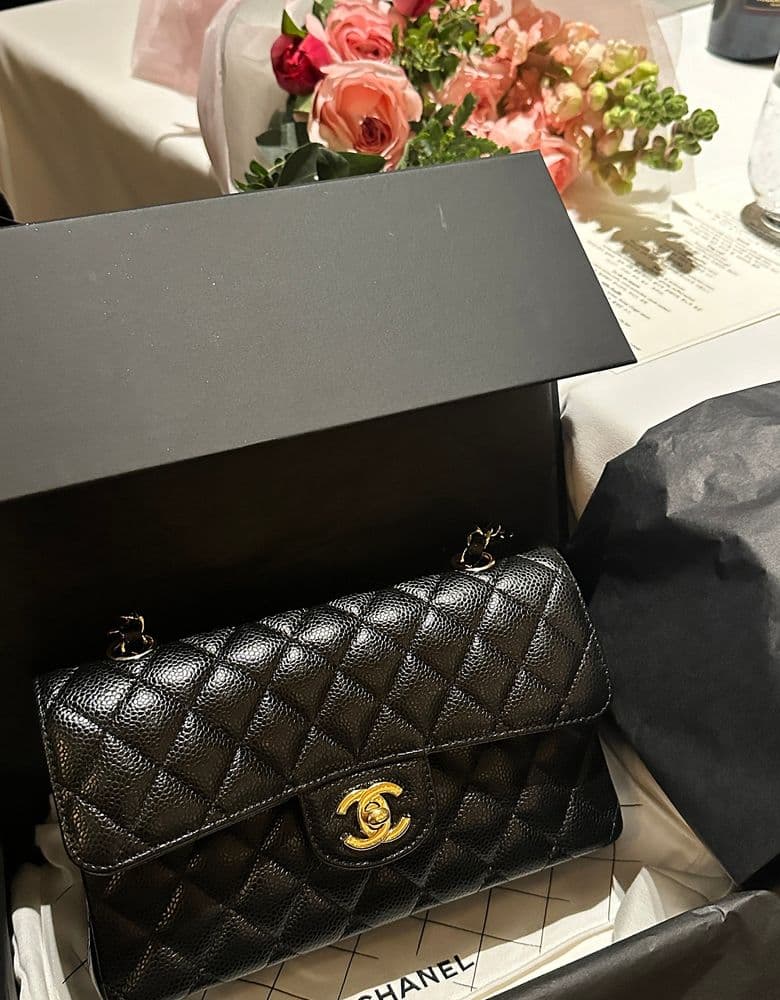 안녕하세요~~ 샤넬클래식백 스몰 리뷰 입니다 저의 로망이었던 샤넬백을 남편이 프로포즈선물로 사줬어요>_< 너무너무 예뻐요~🖤 샤넬은 사랑이죠 ㅎㅎ 제가 체구가 작은편이라 미디움은 너무 크게 느껴지더라구요 스몰이 딱! 제몸에 감기는게 너무 좋아요!!ㅎㅎ 그리고 저는 은장보다 금장이 잘어울리더라구요~~!! 직접 들어보면 어떤게 더 잘어울릴지 느낌이 바로 올거에요!ㅎㅎ 저희는 롯데백화점 본점에서 구매했습니당ㅎㅎ 오픈런 없이 갔는데 운좋게 바로 겟 할수 있었어요!! 구매하고나서 요렇게 쇼핑백이랑 인증샷 찍어주는게 국룰이죠 >_< 넘예뽀용~♥ <장/단점> 장점 =>예쁘다/ 영롱하다 /기스가 안난다 /여러스타일 옷에도 다 잘어울린다 / 유행안타고 오랫동안 늙을때까지 사용가능하다 단점 =>내부가 매우 작다 / 내부가죽에 손스크래치가 쉽게나서 이너백 필수 (사몰가로 맞춤) <구매일&방문일/장소/가격> 작년에 롯데백화점 본점에서 1,390만원으로 구매했는데 벌써 1,497만원으로 올랐네요!! 샤테크 성공인가요?!ㅎㅎ <리뷰> 샤넬 클래식은 영원하죠~!! 로망이었던 샤넬클래식백을 가질수 있어 너무너무 행복해요~~!! 최대한 많이많이 들고 다닐려구요💕
