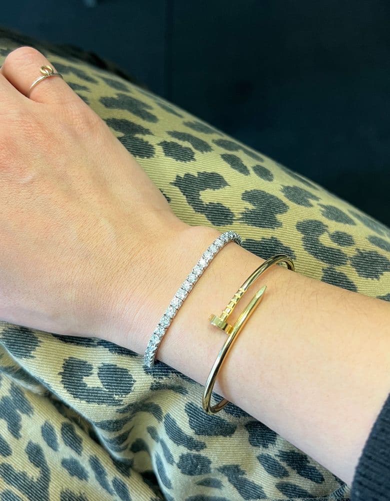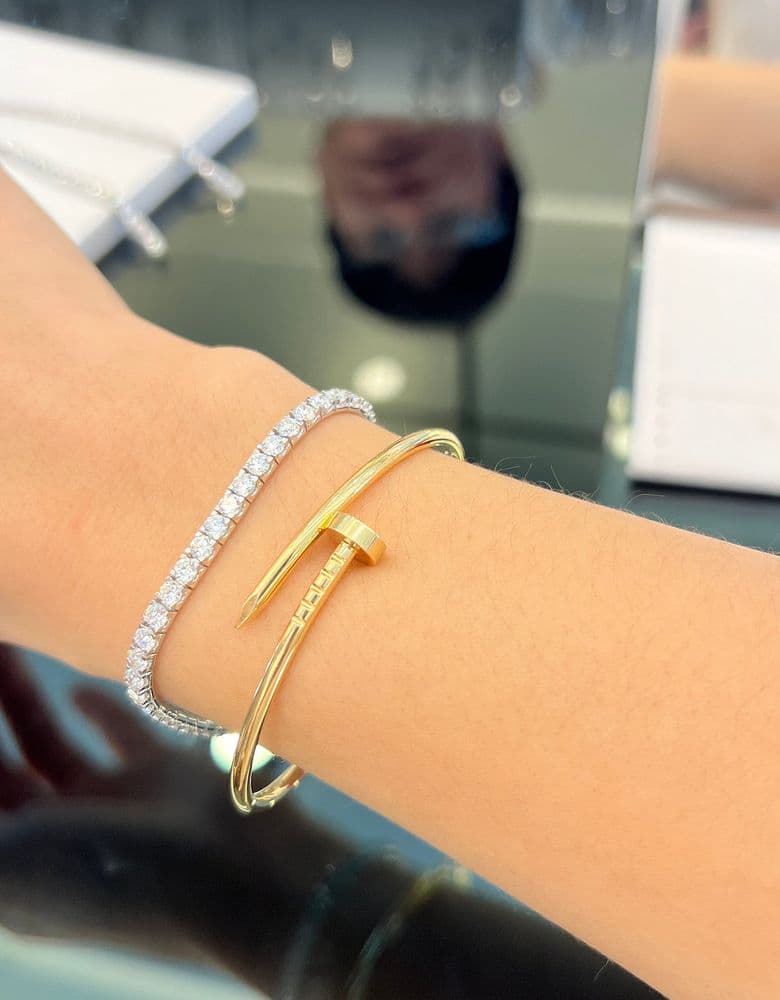 쥬얼리의 매력을 모르다가 최근 들어서 이제 막 눈을 뜨기 시작한 응애(?)입니다 ㅋㅋㅋ 평소에 옷을 조금 화려하게 입는 편이라 쥬얼리는 좀 심플하게 하고 싶어서 막 요기조기 알아보다가, 핀터 언니의 멋진 사진에 꽂혀서 결국 까르띠에 앵끌루 sm 노다이아 옐골로 구매 해버렸지 뭐에요…🌝 애기 데리고 후딱 가서 사오느라 사진이 이거 밖에 없네욬ㅋㅋㅋㅋ 사진은 못 찍었지만, 향수 샘플도 챙겨 주시고, 주스도 주시고, 예쁜 꽃 앞에서 사진 찍으라고도 해주셨어요. 나중에 as 맡기러 또 갔었는데 저희 애기가 ㅋㅋㅋㅋㅋ 엄마 왜 이번엔 주스 안주냐며 ㅋㅋㅋㅋㅋ🤣 주스는 물건을 살 때만 주는 거야.. 아무때나 안 줘.. 처음에는 아래 사진처럼 심플하게 앵끌루만 차고 다녀야지 했는데, 사람 마음이 요상한 게 자꾸만 레이어링을 하고 싶어지지 모에요…?! 그래서 주변 언니들에게 문신템으로 추천받아 테니스 팔찌를 사러 다녀오게 되었습니다 ㅋㅋㅋㅋ 급 발진 테니스 팔찌는 고민을 많이 하다가 다른 분들 후기를 보고 시크 연계된 엘도라도에서 구매했고, 가서 대표님께 상담을 받아보니 합리적인 가격에 뛰어난 퀄리티의 팔찌를 구매할 수 있는 랩다이아 듀포테리얼이 확 끌리더라구요. 요즘 금 값이 미친 듯 올라서 14K, 18K 골드를 사고는 싶지만 가격적으로 부담이 된다고 생각이 들었는데😭 이에 대한 대안으로 엘도라도에서 개발한 것이 2.4K 신소재 듀포테리얼이라고 하셨어요. 믹시, 실크, 퀸즈 이렇게 다양한 타입이 있는데, 저는 손목에 조금 더 착 감기는 느낌이 좋아서 실크 솔리드로 구매를 했어요. 사진에서 보시는 것처럼 엄청 부드럽게 휘어지는 스타일❤️ 랩다이아는 최상급으로 세팅해주시고 이후에 혹시라도 사이즈업을 원한다면 엘도라도에서 매입도 가능하다고 하시더라구요. 사이즈는 1부랑 1.5부를 고민하다가, 제 팔목에는 1.5부는 너무 과한 느낌이라 요번에는 일단 1부로 땅땅땅! 쥬얼리를 좋아해서 잘 아는 언니랑 같이 갔는데, 그 언니도 광채가 또렷하게 살아있고 세팅이 엄청 정교하다면서 본인이 가지고 있는 18K 골드 다이아 테니스 팔찌랑 비교했을 때도 전혀 뒤지지 않는다고 말해줬어요. 언니한테 확인도 받았고 저도 실제도 착용해보니 손목에 착 감기는 느낌도 좋고 가격도 합리적이라 바로 구매를 해버렸습니다 ㅋㅋㅋㅋㅋㅋㅋㅋ 주문하고 받는데는 한 2주 정도 걸린 거 같아요. 이건 저의 비루한 착샷들…!! 한 두개 사다보니 갑자기 쥬얼리에 눈을 엄청 떠서 👉🏻👈🏻 이제는 또 반클 스프링 무당벌레도 사고 싶구.. 스위트 알함브라도 사고 싶구.. 그러네요… 심플하고 키치한 거 좋아하는데 넥스트템으로 뭐가 좋을지 마구마구 추천해주세용