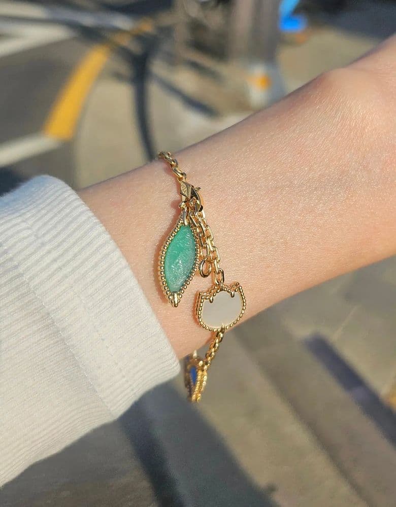햇빛 받았을때 모습도 궁금하실 거 같아서 나오자마자 찍어봤어요 😍 ✔️ 구매일&방문일&장소&가격 4. 5. 압구정 현대백화점 1080만원 사진보다 더 예쁘고 초록 나뭇잎 부분도 사진과 달리 햇빛 받으면 투명하게 보여서 좋아요 (사진만 봤을땐 그냥 불투명 찐초록인줄 알았거든요) 파란 나비🦋 가 정말 영롱하고💙 벚꽃🌸 모양도 제 맘에 쏙 들어요 너무 예쁩니다 🥰 팔목이 얇아서 길이를 2cm 정도 줄이는걸 추천하셨는데 그럼 맡겨놓고 또 2주 기다려야 한다고 해서 포기 ㅠㅠ (그래도 차고 다니다가 1년 안에 요청하면 무상으로 줄여준다고 합니다) 하루라도 더 빨리 차고싶어 그냥 중간 줄에 걸어 차고 다니기로 했습니다 (이미 빈티지 알함브라 5모티브 팔찌도 그렇게 하고 다니고 있어서요 😅) 남편이 2월에 사진으로 먼저 보고 저한테 어울릴거 같다고, 선물하고 싶다고 했어요 그래서 미리 주문해두고 엄청 오래 기다렸다 오늘에야 받았네요 진짜 실물이 더 예쁘고 제 스탈이에요🦋 남편이 고마우면 자기 선물도 좀 사달라는데 전 돈이 없어요 어쩌죠 😂