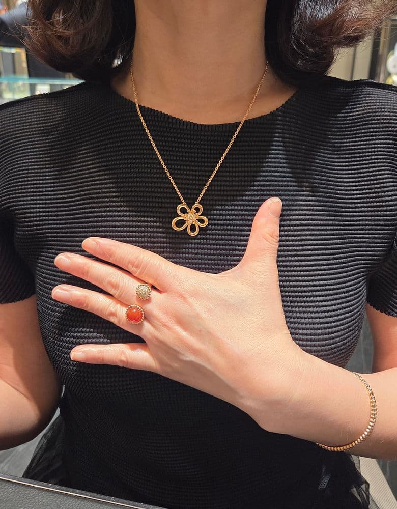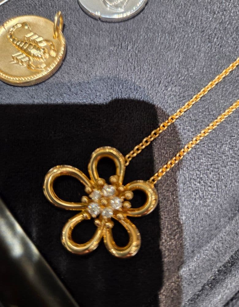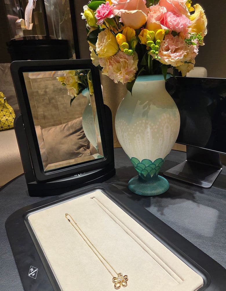 찻샷이고 5센티 연장 후 길게했을때 길이에요. 연장하실분들 참고하세요 손에 착용한반지는 매장에 있는반지 매니저님이 착용해보라고 가져다주셔서 껴봤는데 이쁘네요💯 ✔️ 구매일&방문일&장소&가격 2026년 1월 28일 롯데 잠실 에비뉴엘 반클리프 매장 1200만원 ✔️ 상품리뷰 사진상으로는 별로 구매욕이 들지 않았고 원래는 조디악목걸이 구입하러갔다 실물보고 반해서 조디악대신 플라워레이스로 구입했어요. 일단 금값비싼 요즘 금중량이 많은게 맘에들고, 묵직하고 존재감이 있어요. 구입후 줄 5센티 연장해서 블라우스안에는 짧게 하고 니트등에는 길게 가능해요. 신상이라 예전가격 생각하며 속상할 팔요없는것도 좋네요.😄 단점은 꽃잎 모양이 비대칭이라 그런지 목걸이가 살짝 한쪽으로 쏠릴때가 있어요. 결혼 25주념 기념으로 구입했어요. 결혼기념일은 12월이지만 몇개월에 한번씩 가격을 올리기때문에 미리 땡겨서 구입했어요😂😂😂 오더하고 3개월정도 기다렸는데 그사이에 또 올라서 1260만원이 됐네요.