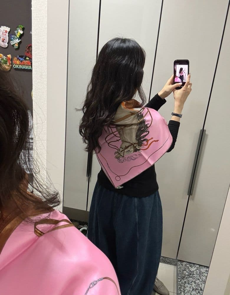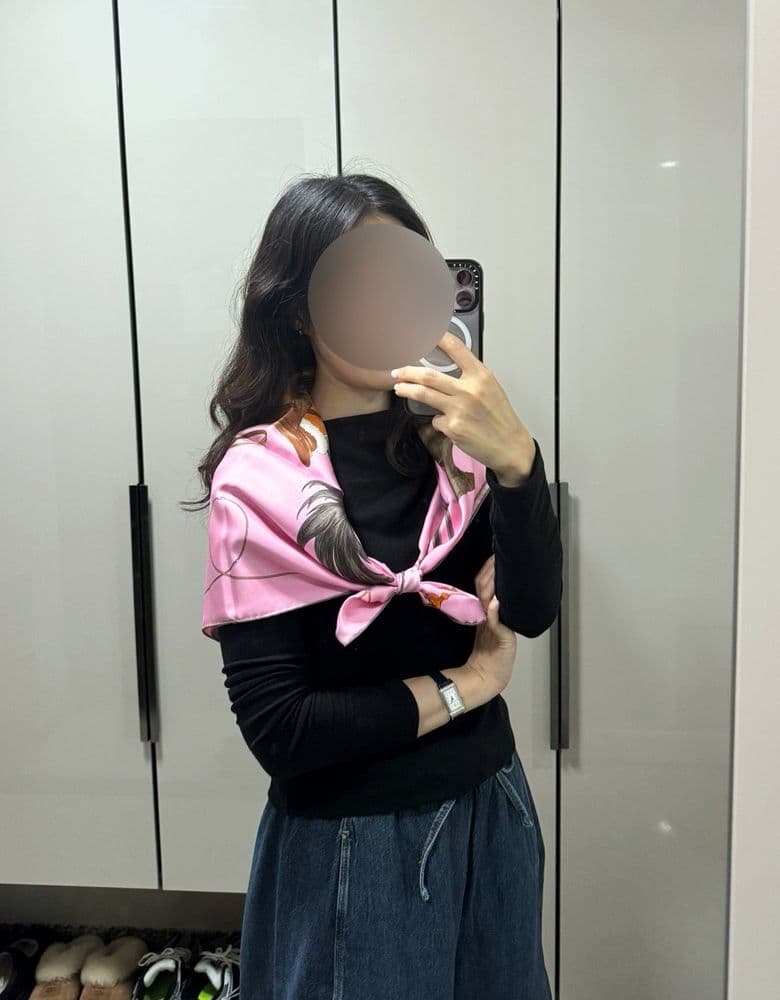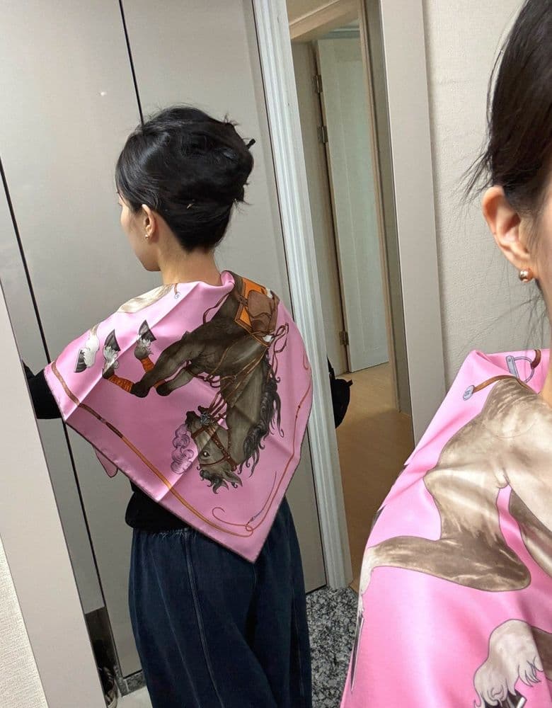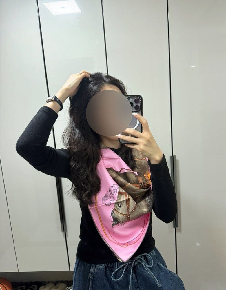 ✔️ 구매일&방문일&장소&가격 : 2026.04.18. 신강 / 990,000 ✔️ 상품리뷰 지난 토요일 신강 도착하자마자 대기줄 없어서 뭐라도 보자 하고 들어가서 사왔습니닥 그랜드 갤롭? 그랑 갈롭? 로즈드라제 컬러 💕 사실 스카프 사고싶을때 공홈 들락달락 하면서 첫눈에 반한 까레인데, 마침 매장 전면에 진열 되어있어서 냉큼 저거요 🥹 하고 받아왔습니당 ㅋㅋㅋ 하지만… 분명 서울에서 둘러볼땐 너무 예뻤는데 제가 사는곳으로 오니 과일박스 보자기 같음…. ㅋㅋㅋㅋㅋㅋㅋㅋ 아 큰일났습니다 ㅋㅋㅋㅋㅋㅋㅋㅋ 청바지나 좀 갈아입고 둘러볼껄 🤣💦 턱받이로 말 한마리 🐎 공홈 착샷 따라해봅니다 ✨ 다림질 해서 좀 펴지면 괜찮아질까요 ㅠㅋㅋㅋㅋㅋㅋ 짧게도 해보고욥 🌸 공홈 마들님께서 머리를 올리고 찍으셨길래 급 머리를 틀어올리고 다시 한번 둘러봤습니다 🤣💦 (연필로 틀어올린 점 ㅋㅋㅋㅋ) 어떠케 해도 과일박스 보자기 같네요 ㅋㅋㅋㅋㅋㅋ 원피스로 갈아입고 두르면 나아지겠져..? 🙄 청바지라 어색한거라고 믿고싶습니닥 ㅋㅋㅋㅋㅋㅋ 모두 놀래셨을 까레 착샷이었습니당 🌸