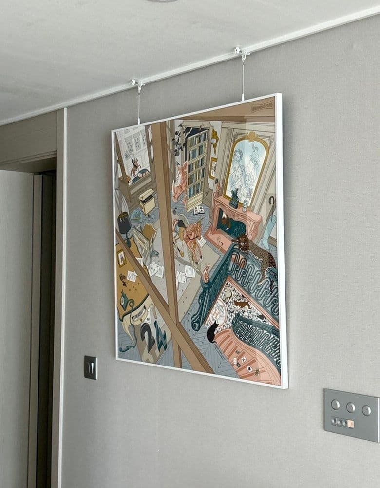 ⭐️ ⭐️ ⭐️ ⭐️ ⭐️ 에르메스 실적 쌓기 시작하면서 ‘불필요한건 사지말자’ 가 제일 컸어요 특히나 맘에 안드는 의류, 시계 (이미 있어서요), 그릇 셀러님이 추천하신다면 정중히 거절하고 필요한것만 사기로 했어요 최근에 지인 집에 놀러갔는데 인테리어를 기가막히게 해놨더라구요 명품이란 명품은 다 있어요 루이비통 트렁크 인테리어부터 루이비통 구찌 소품 가구 베어브릭까지- 그 중에 눈에 들어온 게 명품 스카프액자였지 뭐에요? 플래그쉽 90 액자였는데 그걸 보고 반해서 저도 도전! 아쉽게도 플래그쉽 90 디자인은 없었고 집 분위기와 어울리는 걸 찾다가 ‘미스테리 까레’ 가 눈에 띄었어요 24 ss에서 엄청 난 인기를 보였데요 외국 에르메스 매장 내부를 그린거랬어요 에르메스 스카프는 100% 실크에요 그래서 가격 또한 후덜덜 하죠 상품명 : Mystere au 24 스카프 90 가격 : 78만원 (2024년 기준) 집 컬러가 그레이 계열인데 그래도 잘 어울리죠? 놀러오는 사람들마다 물어봐요 스카프 사서 했다니까 다들 놀래요 저도 따라했는걸요😂 사실 저는 스카프 직접 다리고 액자에 쫙 펴서 넣을 자신이 없어서 업체 통해서 했어요 등록된 주소로 스카프만 보내면 며칠 뒤 완성 된 액자 자체로 집으로 배송와요! 개꿀👍🏻 링크 올려놨어요 쿠팡에서 액자고리만 2개 시켜서 걸기만했어요 78만원+16만원=94만원 거의 100만원짜리 액자 라고 보시면되겠네요 유명한 화가 작가들 작품도 좋지만 그건 또 다음에 도전해 보는거로 하고 전 너무 너무 만족해요💕