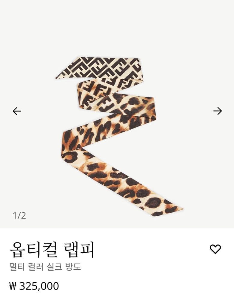 ⭐️ ⭐️ ⭐️ ⭐️ <상품 장/단점과 상품리뷰> 펜디 제품은 가방 하나뿐이고 그 마져도 잘들지 않아 가끔 지나갈때 들리는 브랜드인데 엄마가 커플 스카프나 방도를 좋아하셔서 들어갔다가 구매한 제품이에요 펜디 로고플레이가 부담스럽지않게 애니멀 프린트에 잘 녹아들어 고급스럽고 베이지 컬러베이스라 어느옷에나 잘 어울립니다. 스테디템이라 몇년이 지나도 공홈과 매장에서 판매중이에요 🫶 양면 옵티컬이라 앞뒤 상관없이 신경안쓰고 메도 되어서 좋아요(저는 똥손이라 이게 은근 편리함으로 다가옵니다) 단점은 아무래도 애니멀 프린트라 가을이나 겨울정도(이마져도 추워서 안할듯) 착용 가능한 제한이 있어요 ㅎㅎ 샐러가 손목에 묶어서 연출가능하댔는데 안해봤습니다. 계절의 제한성으로 별하나 뺐어요! <구매시기/구매장소/가격> 21년 가을, 신강, 26만원(오늘 검색해보니 32.5가 되었네요)